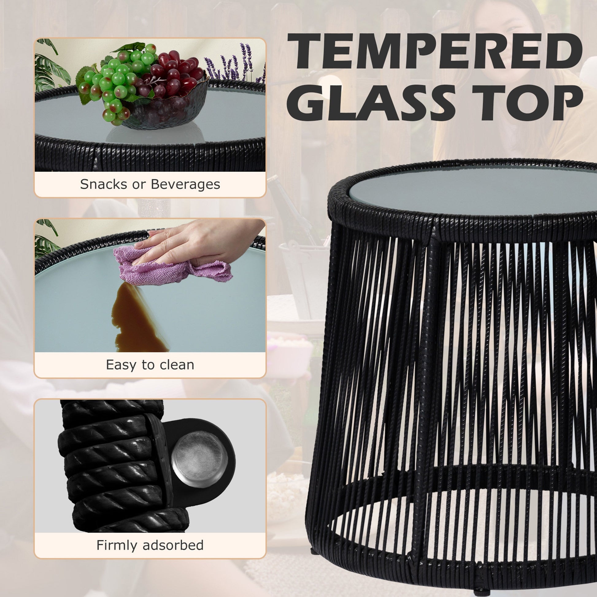Notre ensemble de mobilier de jardin en résine tressée, fabriqué avec du rotin PE de haute qualité et une structure en acier robuste, est durable et conçu pour durer, vous permettant d'en profiter pendant de nombreuses années. Cet ensemble bistro d'extérieur comprend une élégante table d'appoint en verre, idéale pour savourer un verre de vin, votre café du matin ou lire le journal. Sa résistance aux intempéries facilite le nettoyage. La table basse en verre trempé se nettoie en un clin d'œil des taches d'eau. Conçues pour un confort optimal, les chaises de véranda élégantes sont dotées de coussins épais en mousse et de pieds réglables, pour une utilisation aussi bien à l'intérieur qu'à l'extérieur. Cet ensemble de mobilier de jardin est parfait pour les abords de la piscine, la pelouse, le jardin, la terrasse, la cour, etc. Il vous offrira un confort absolu pour vos moments de détente.