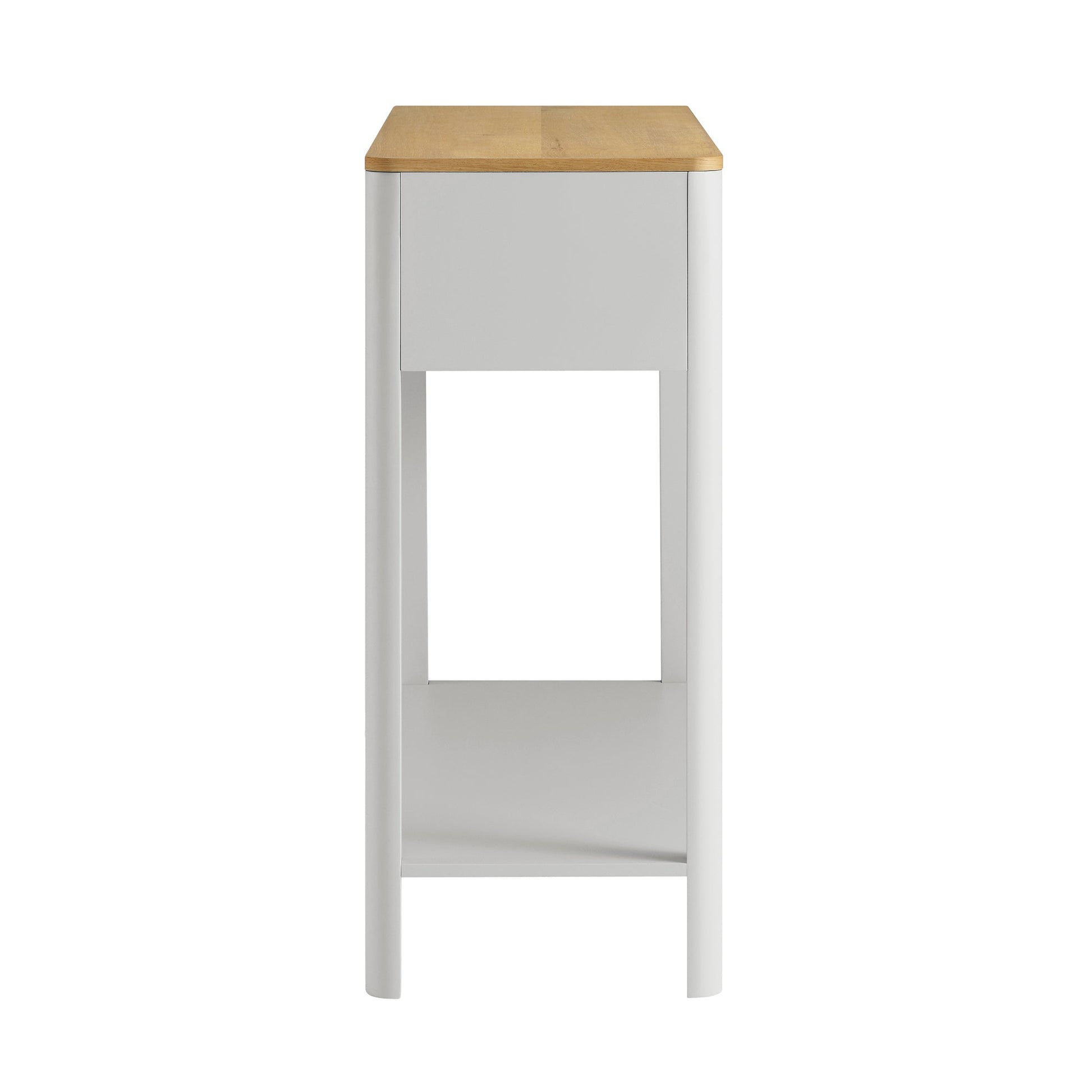 Console Agnes à 2 tiroirs et bords incurvés, gris tourterelle avec plateau en chêne