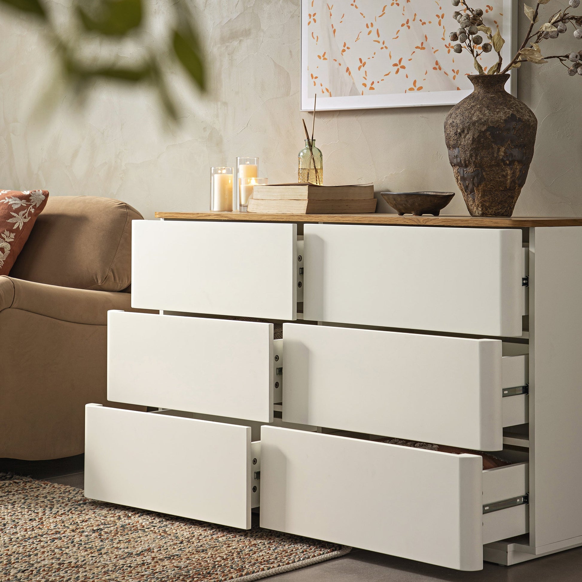 Commode 6 tiroirs à bords incurvés Agnes, blanc cassé avec plateau en chêne