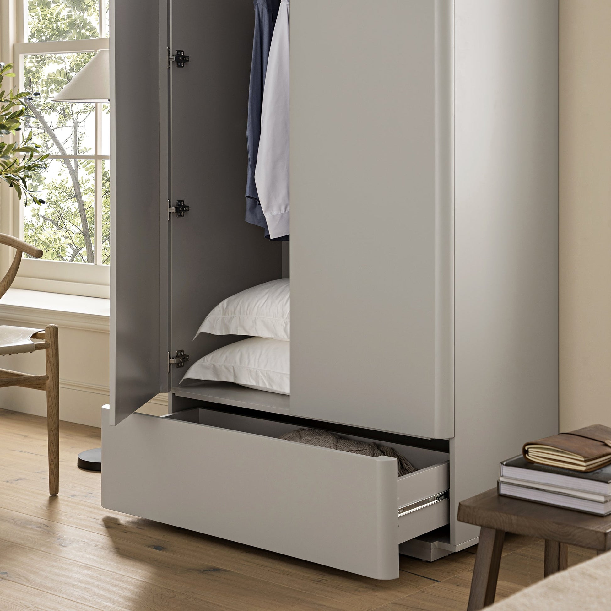 - L'armoire double présente un profil incurvé sans poignée grâce à la conception à ouverture par poussée qui remplace intelligemment toutes les poignées pour un look épuré.