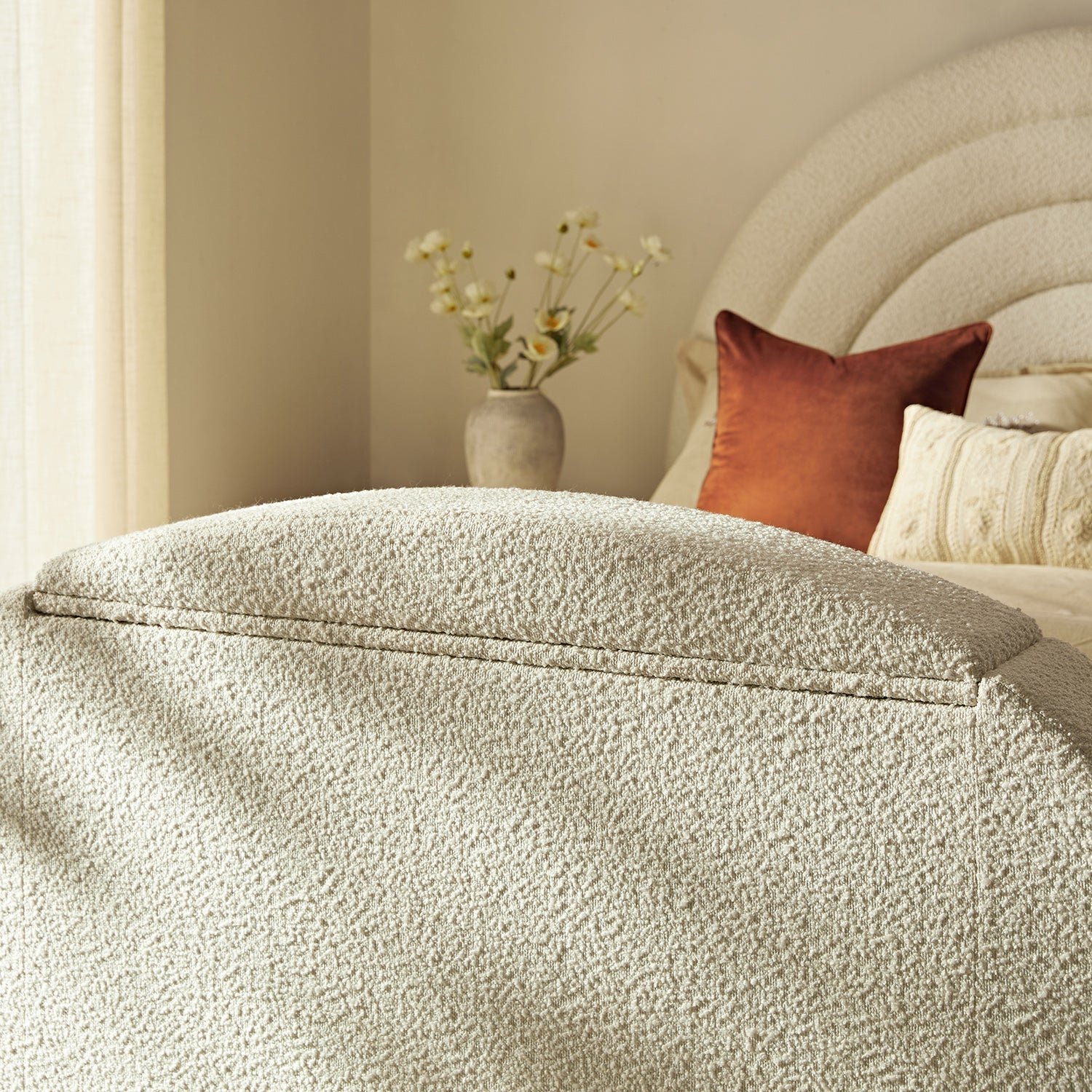 - Recouverte d'un tissu bouclé blanc tactile, la tête de lit arquée et superposée ajoute une touche architecturale audacieuse tout en offrant une présence douce et enveloppante dans votre chambre.