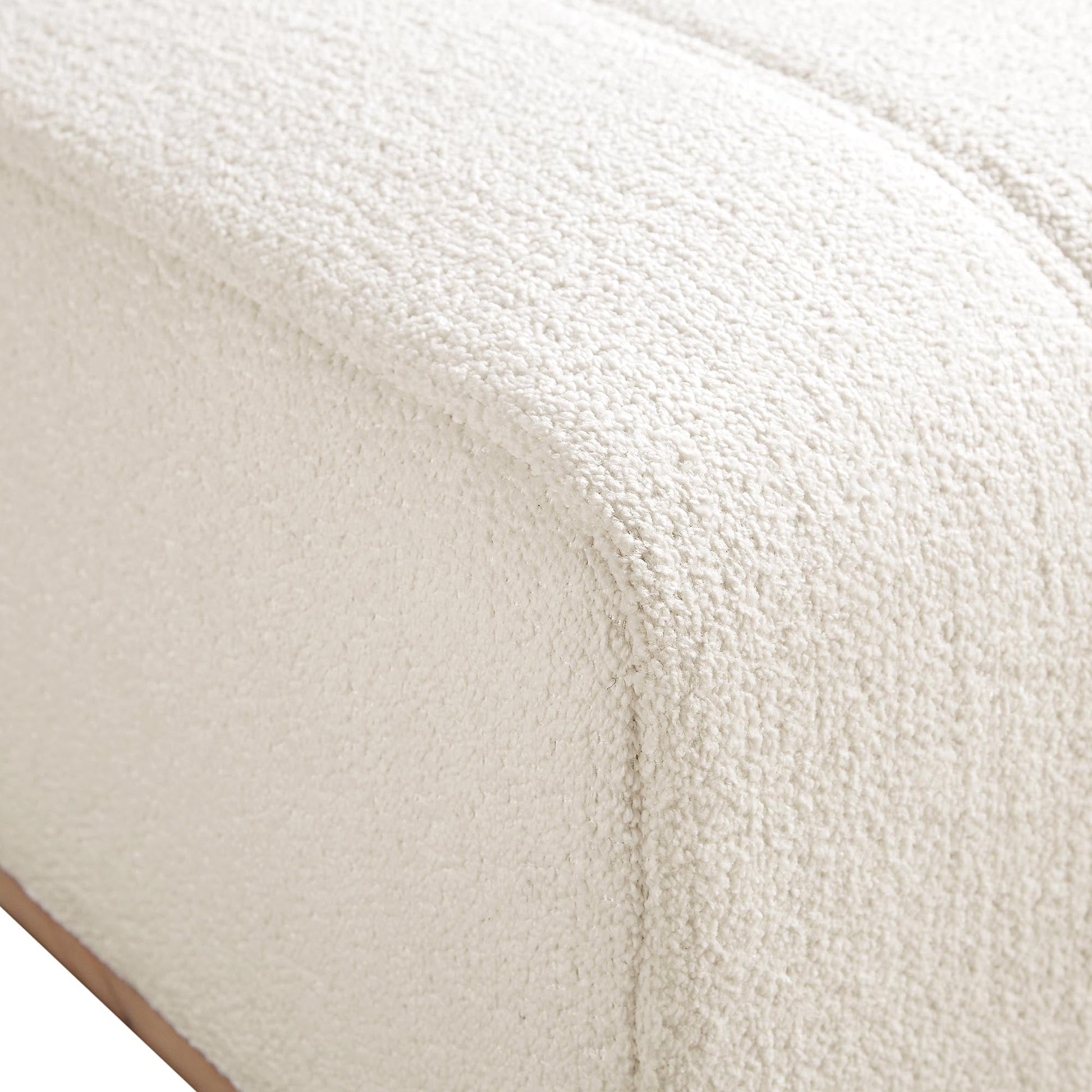 - Tissu bouclé beige tactile associé à une base en bois massif dans une teinte naturelle mate pour un look chaleureux et agréable à l'œil