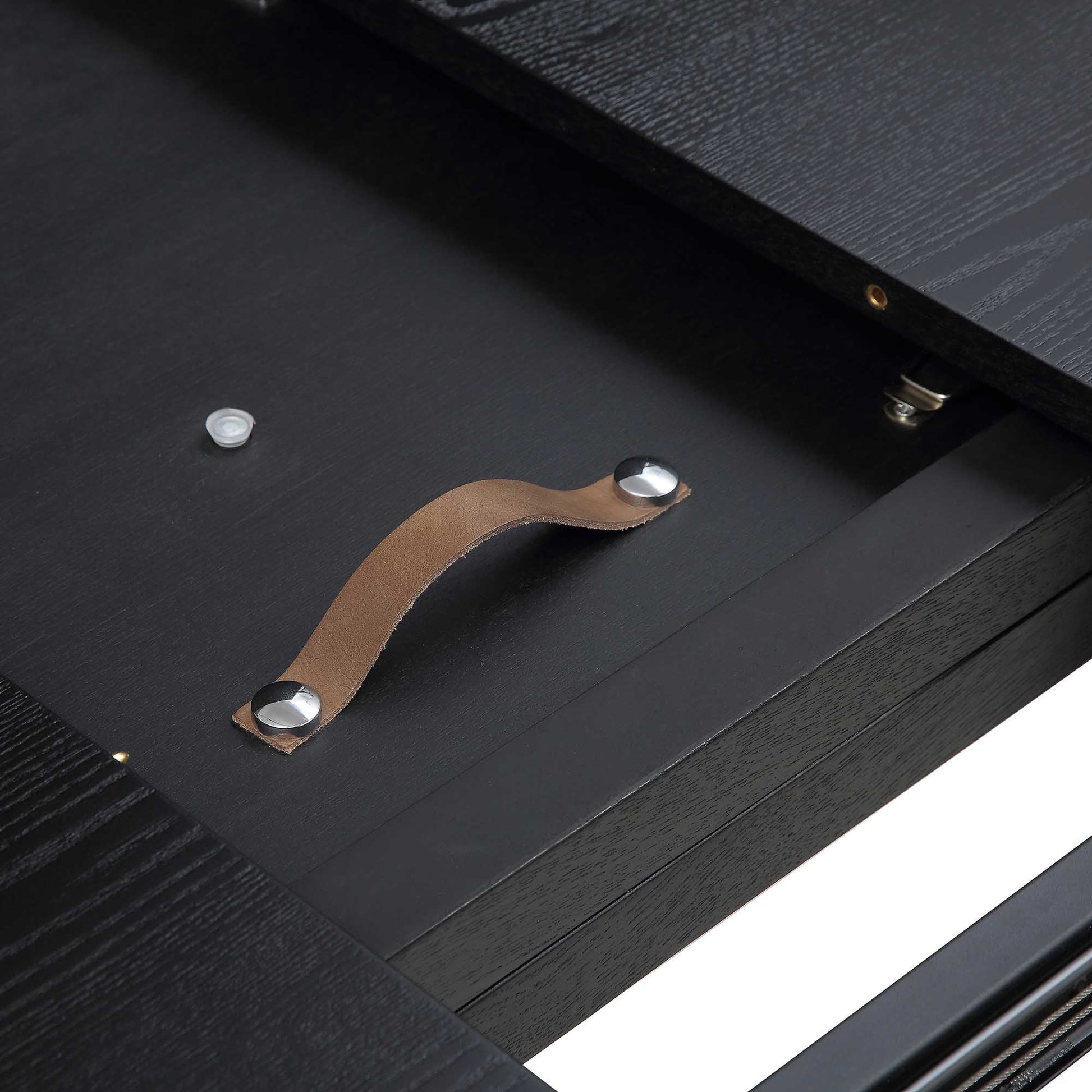 - Le plateau de la table est fini avec un placage en chêne massif teinté noir, chaque pièce est donc dotée d'un motif naturel unique de grains de bois et de nœuds .