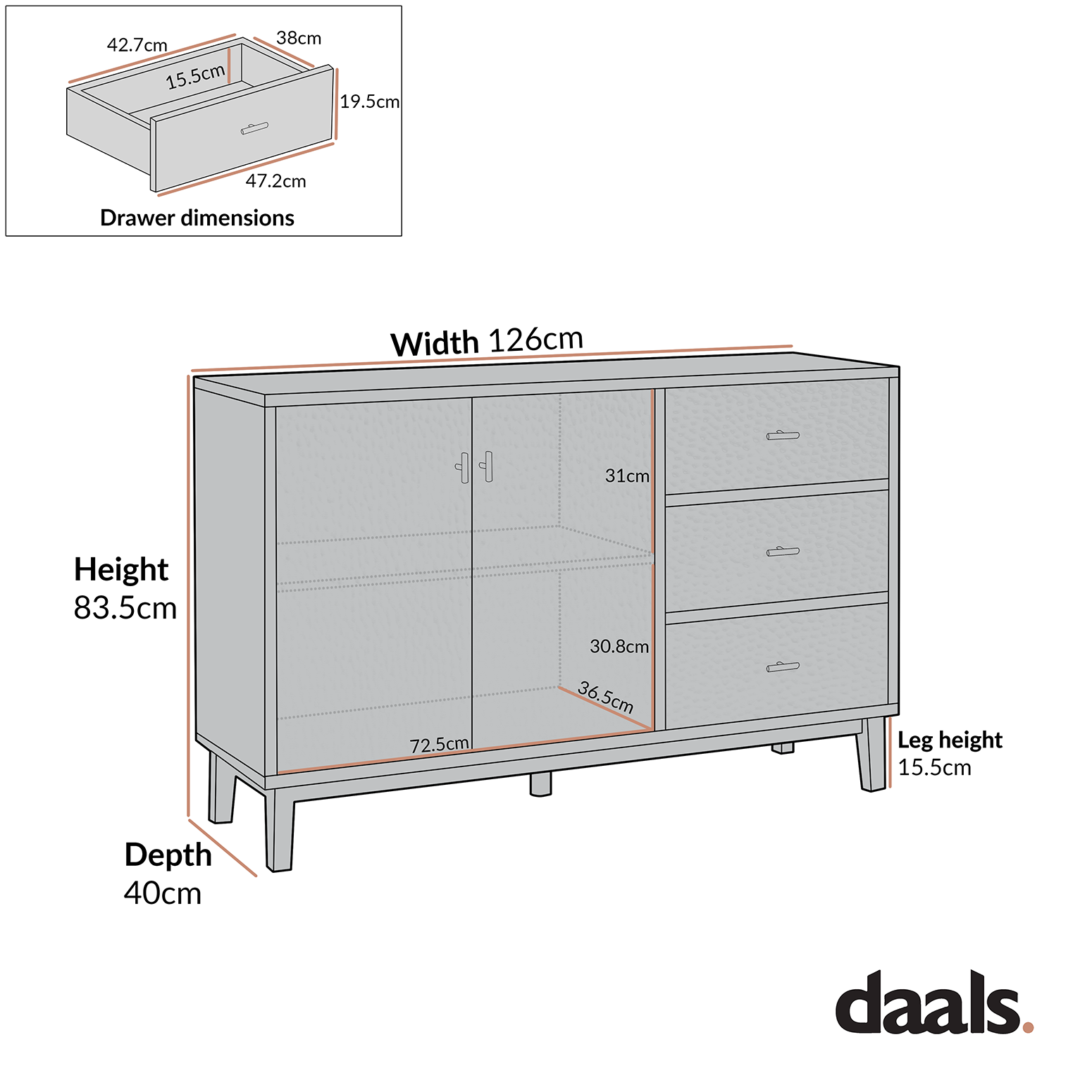 - Le buffet offre 2 portes et 3 tiroirs pour le rangement.
