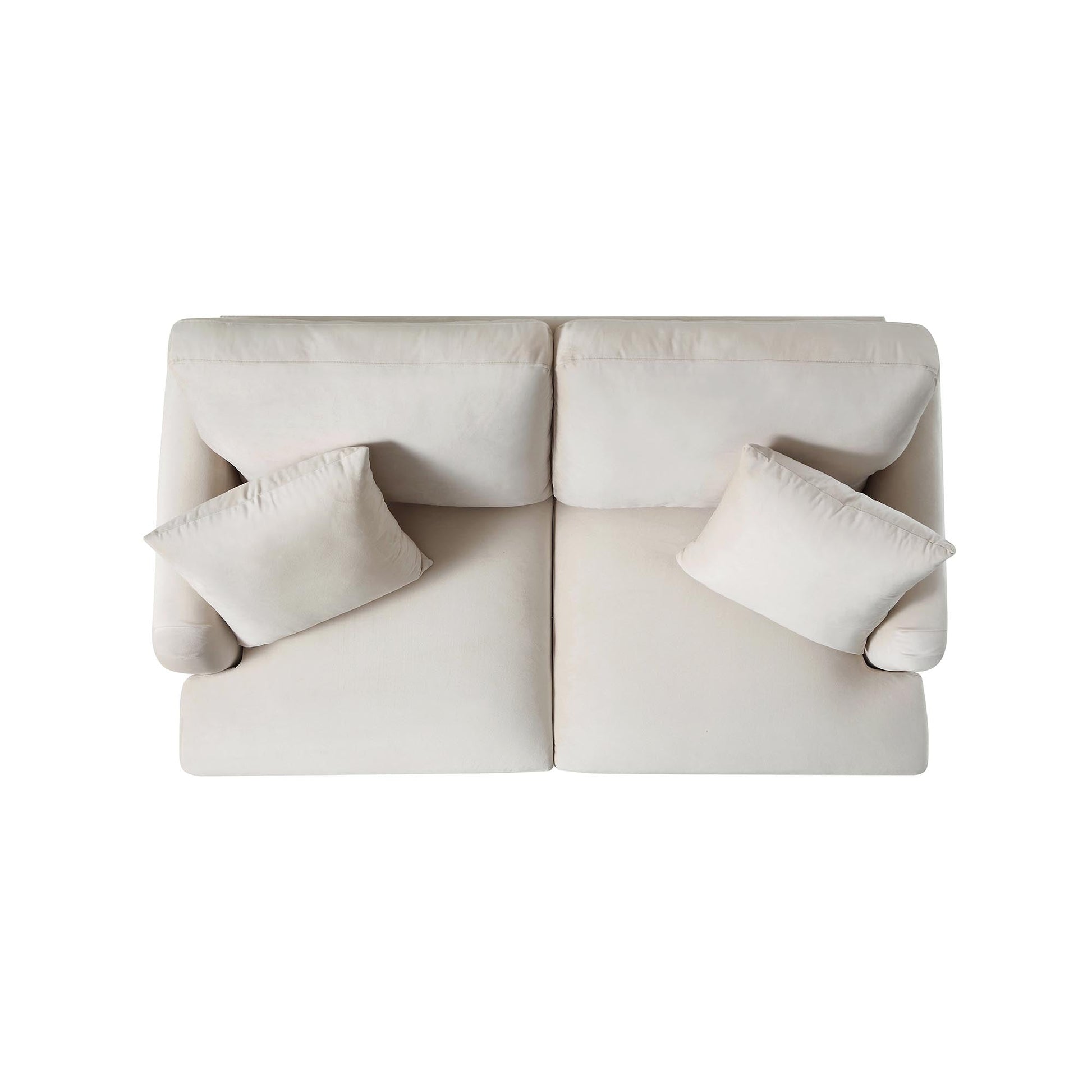 Canapé 2 places Brigette en velours beige avec pieds à roulettes en laiton antique