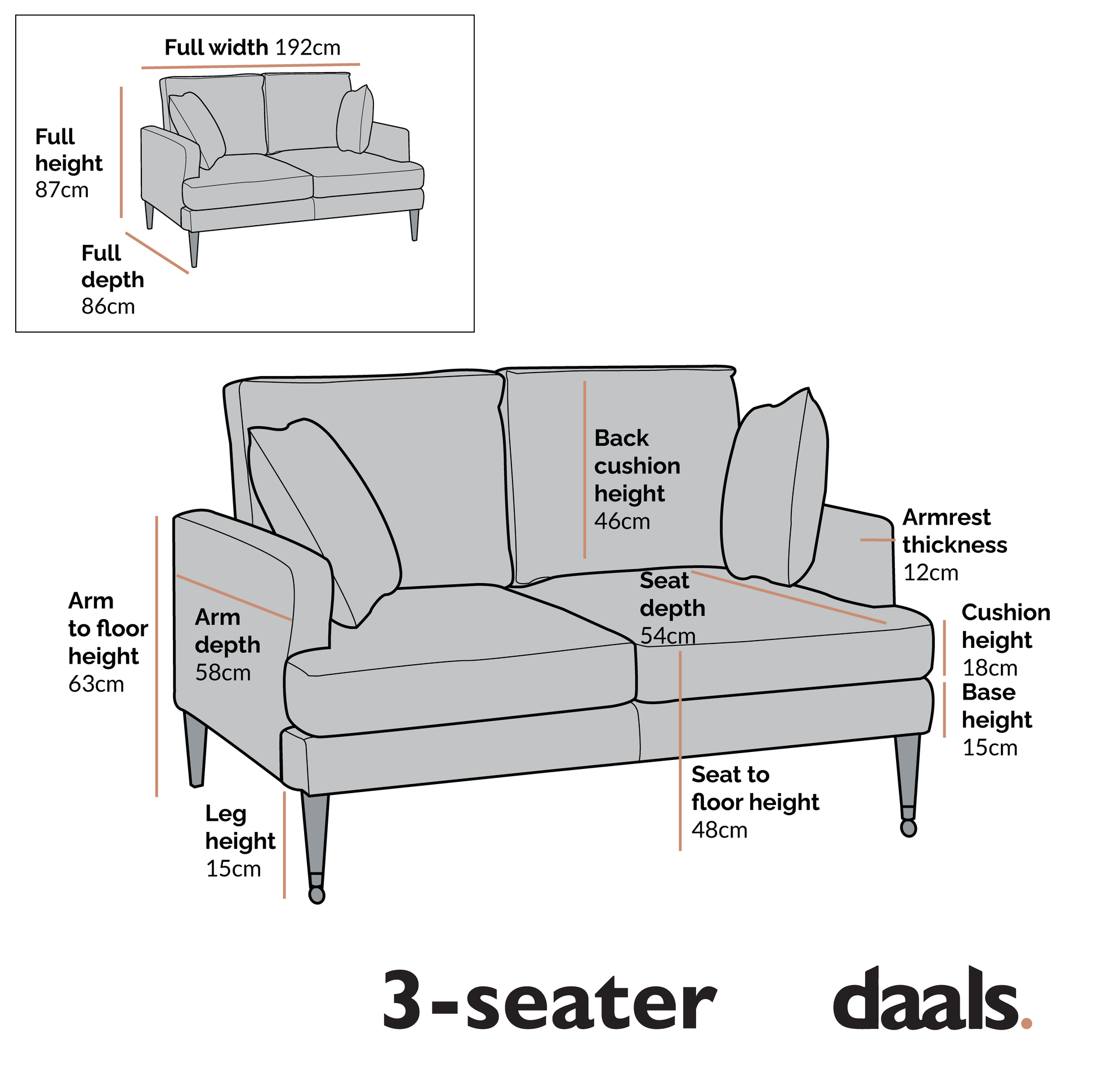 - Dimensions du canapé 2 places : L 150 x P 86 x H 87 cm. Dimensions du canapé 3 places : L 192 x P 86 x H 87 cm.