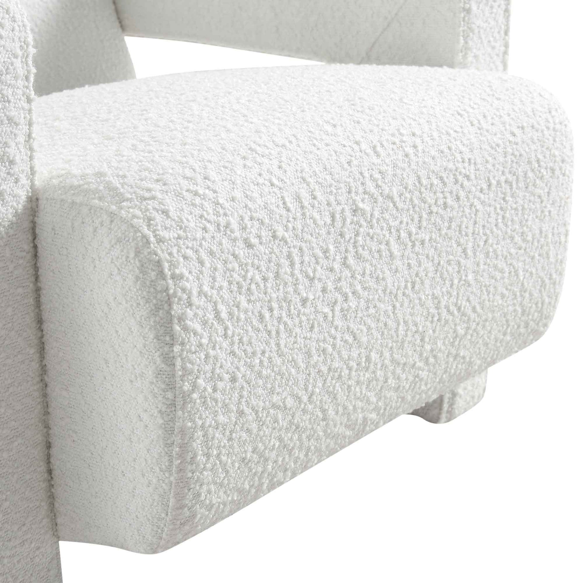 - La chaise est recouverte d'un magnifique tissu bouclé texturé de couleur blanche, idéal pour une décoration intérieure moderne.