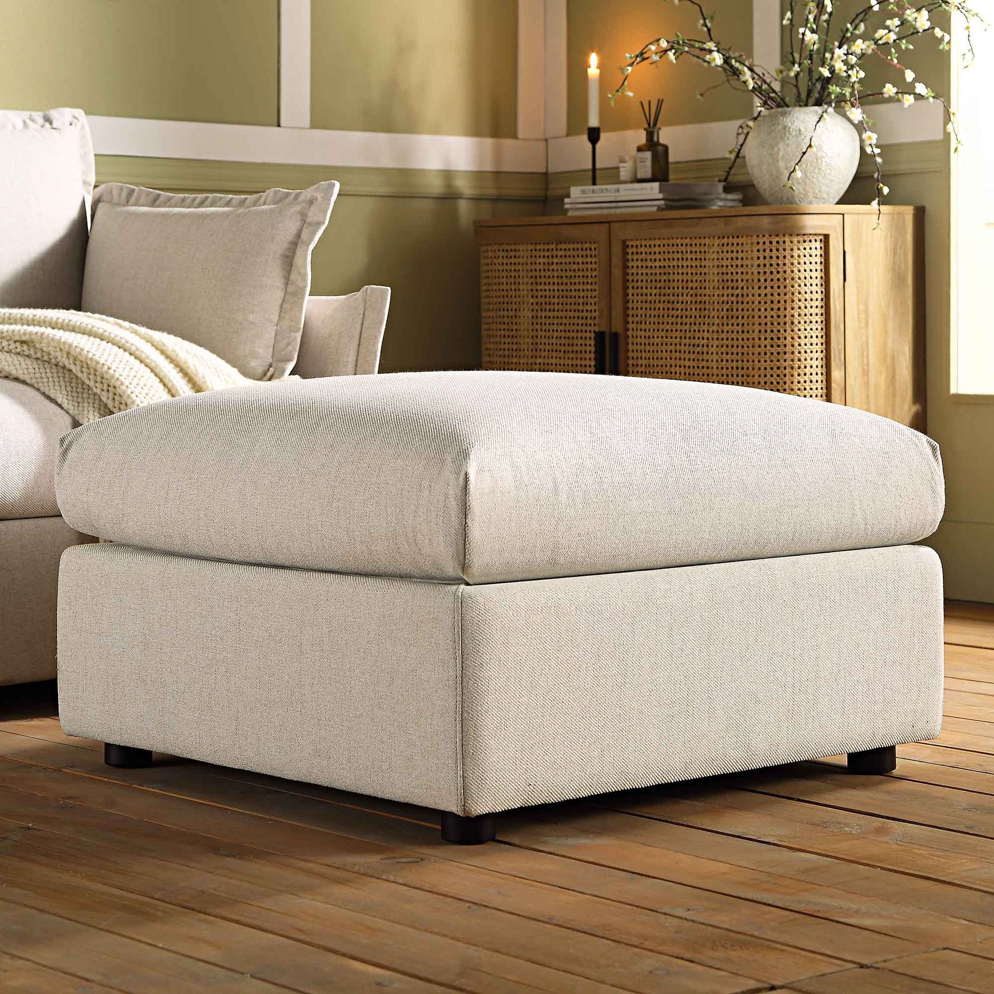 - Complétez le look : sur la photo avec le pouf en tissu beige Byron se trouve notre petit buffet 2 portes en rotin incurvé Izzy