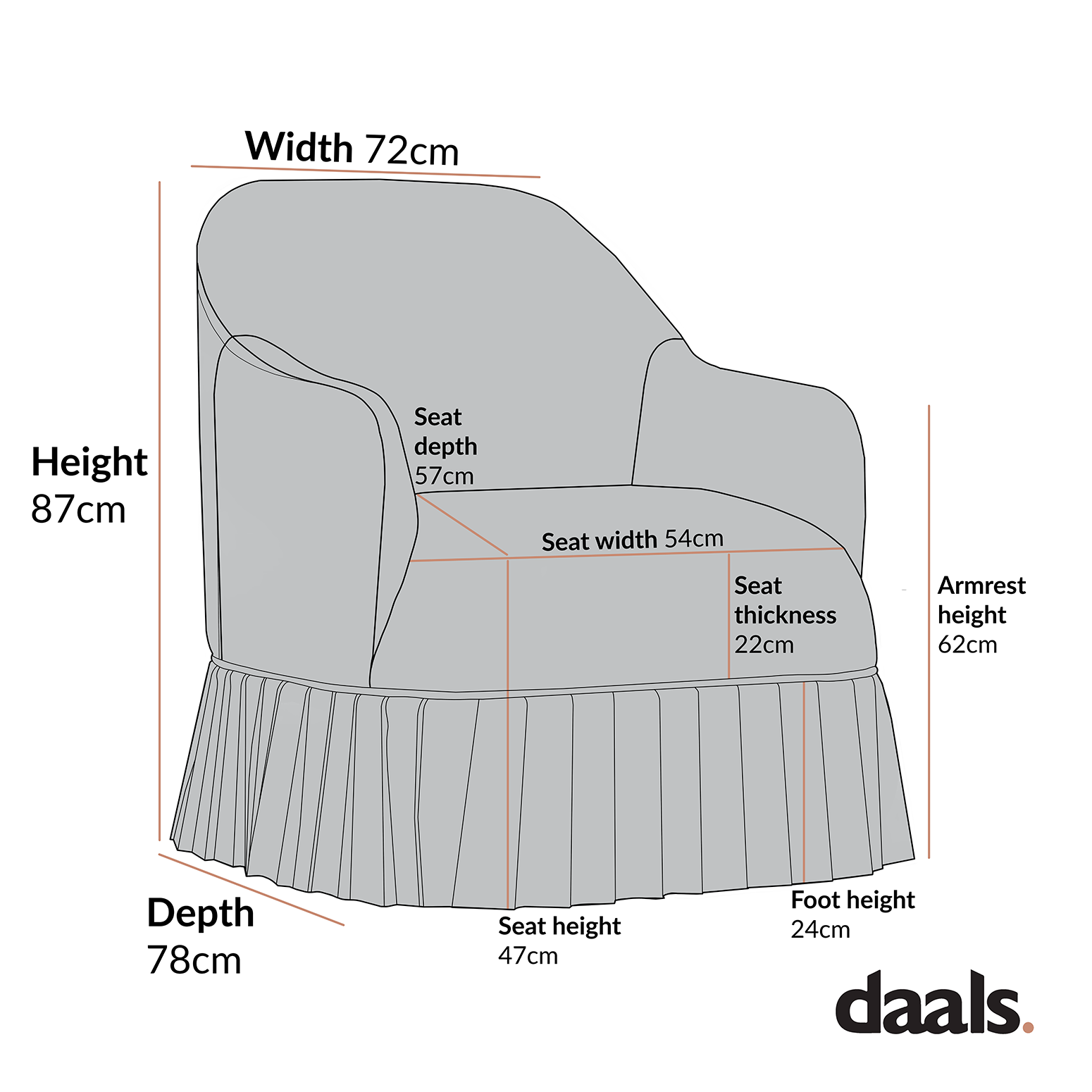 - Conçu avec de beaux accoudoirs inclinés et un fond à jupe, le fauteuil de taille compacte est idéal pour les coins de pièce, les dressings, les salles de bains ou comme siège de salle à manger supplémentaire.