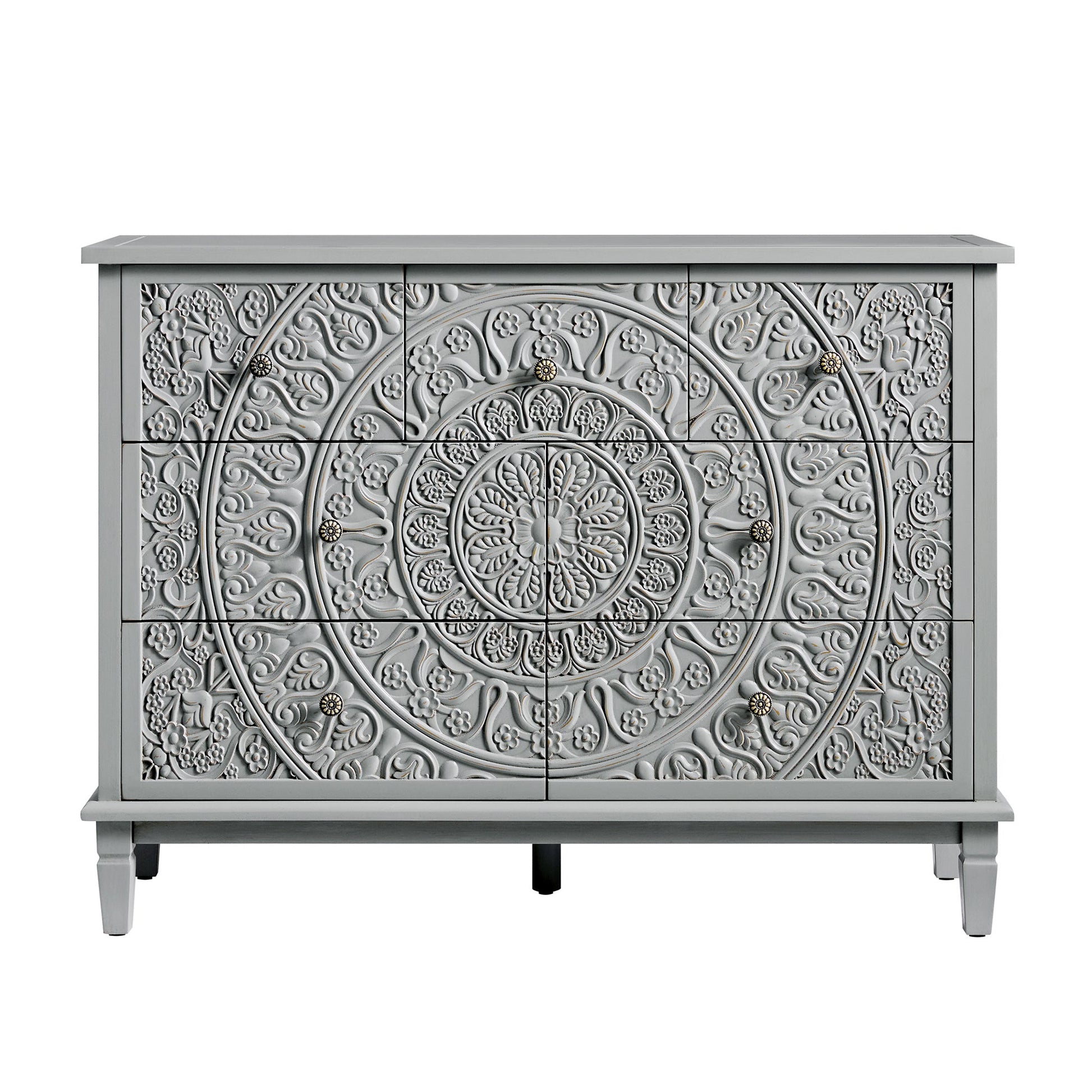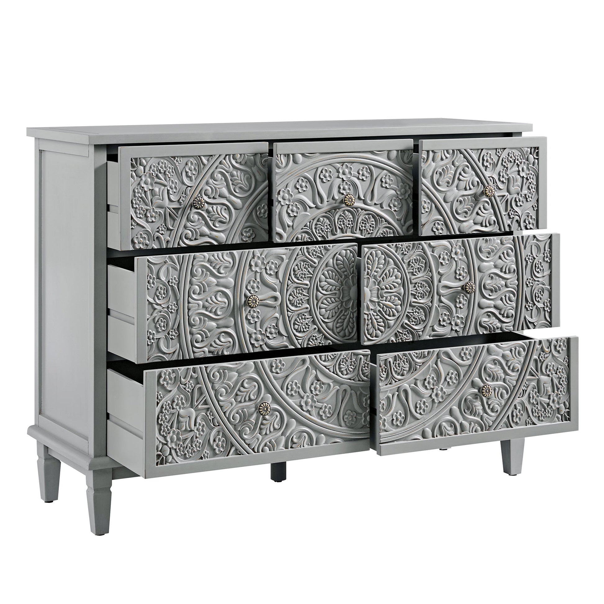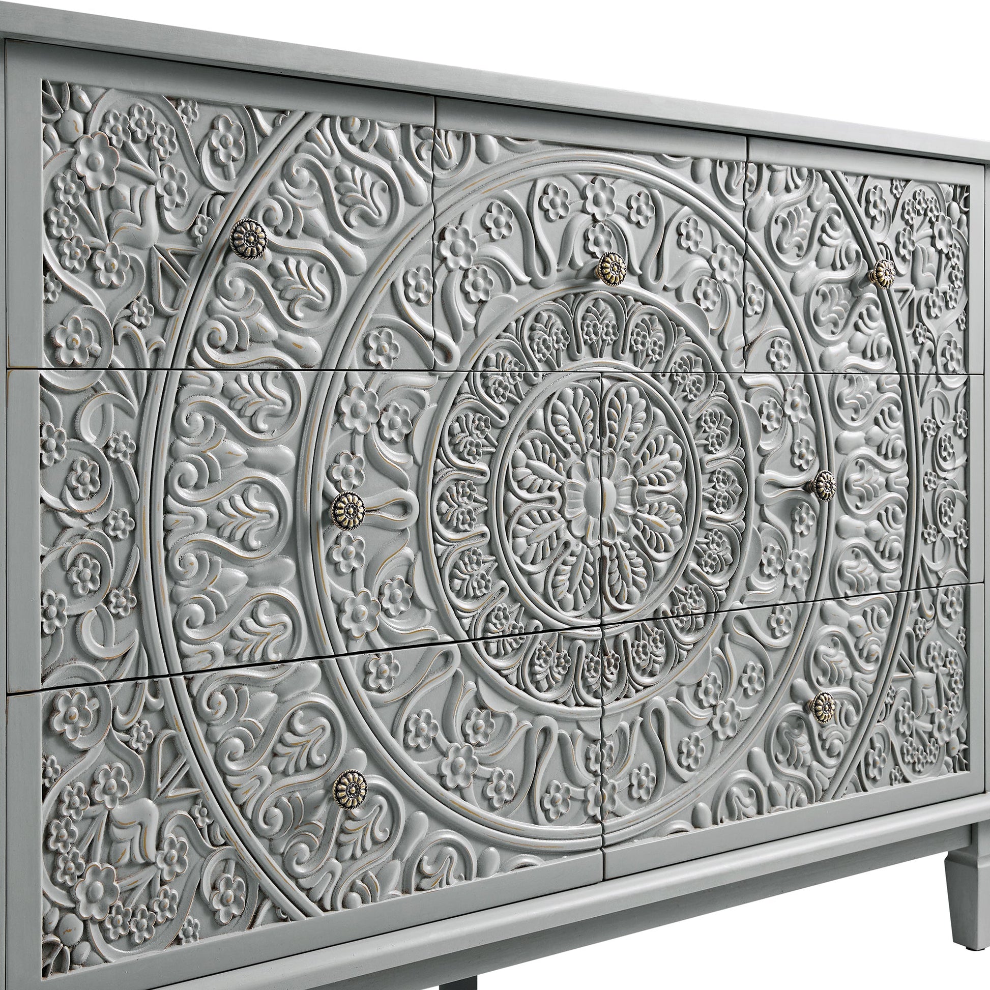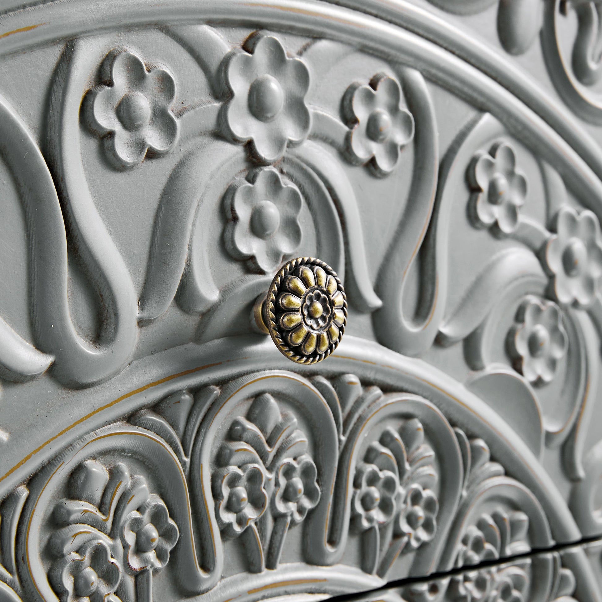 - Le motif floral complexe, sculpté sur les sept tiroirs, apporte profondeur et mouvement au design, tandis que la finition grise moyenne, avec sa nuance bleue, évoque le charme fané des meubles vintage.