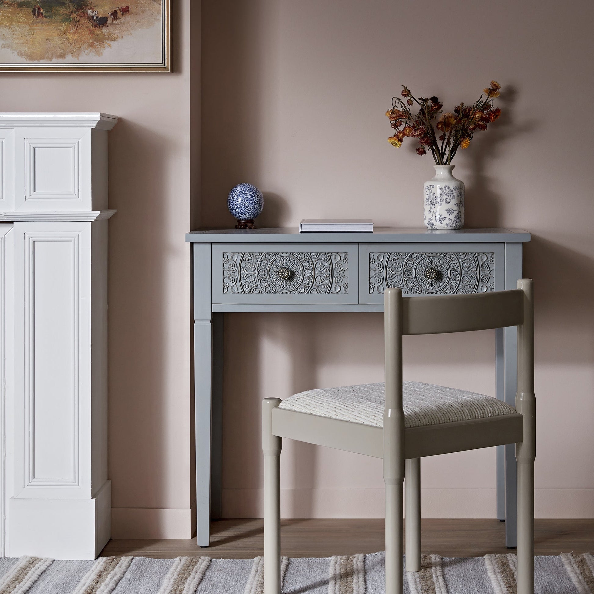 - Complétez le look : sur la photo avec la console/coiffeuse sculptée Chantilly gris moyen, nous voyons notre chaise de salle à manger 2 en 1 Minley Light Taupe High Gloss et notre tapis gris tissé à la main Villa Stripe .