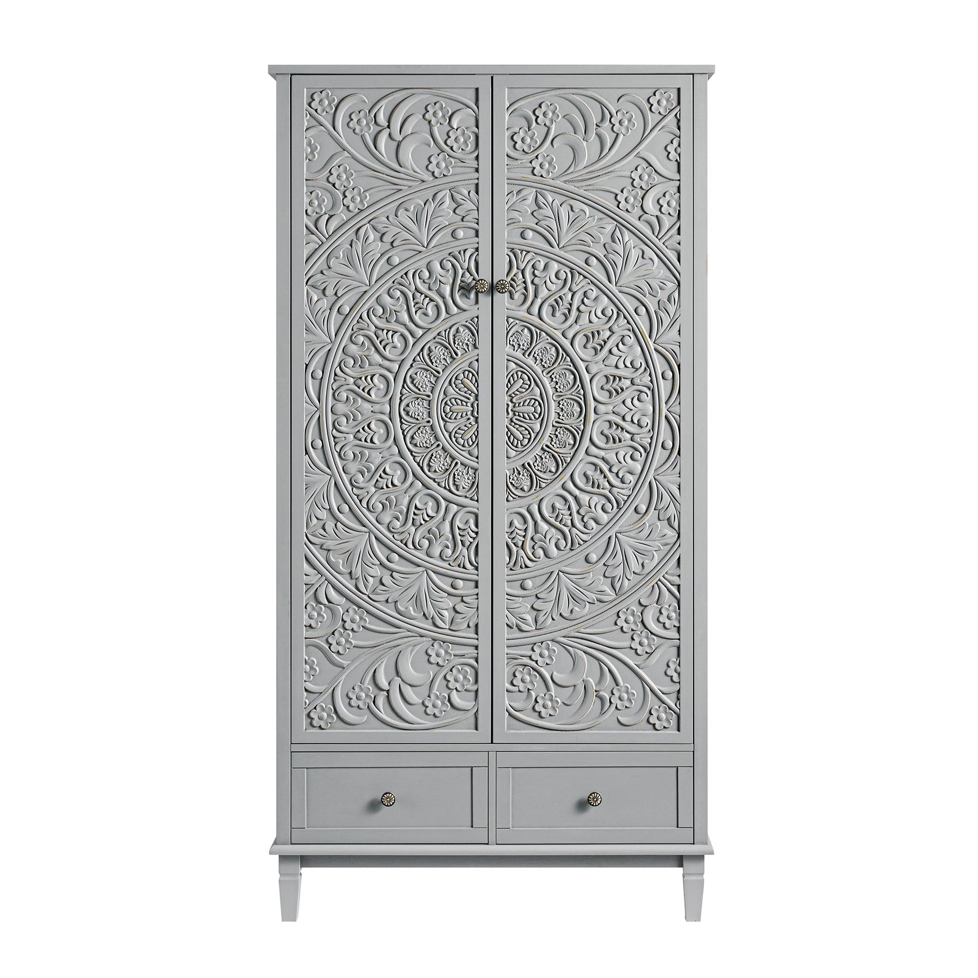 - Les portes doubles sont ornées de motifs floraux sculptés, équilibrés par la silhouette épurée et classique de l'armoire.