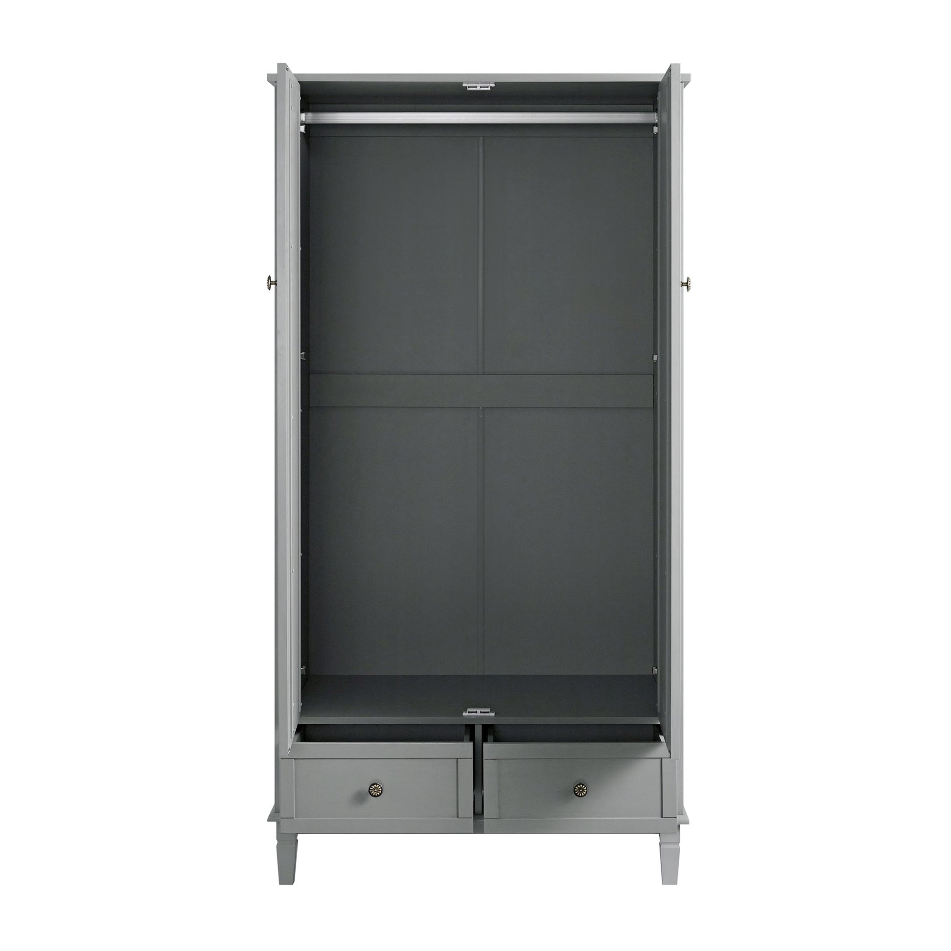 - À l'intérieur, une tringle de suspension offre un rangement vertical pour les vêtements plus longs, tandis que deux tiroirs inférieurs offrent une organisation pratique pour les petits objets essentiels.