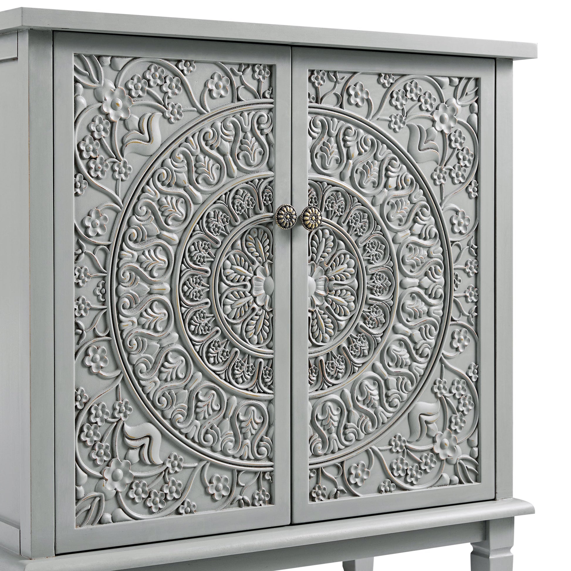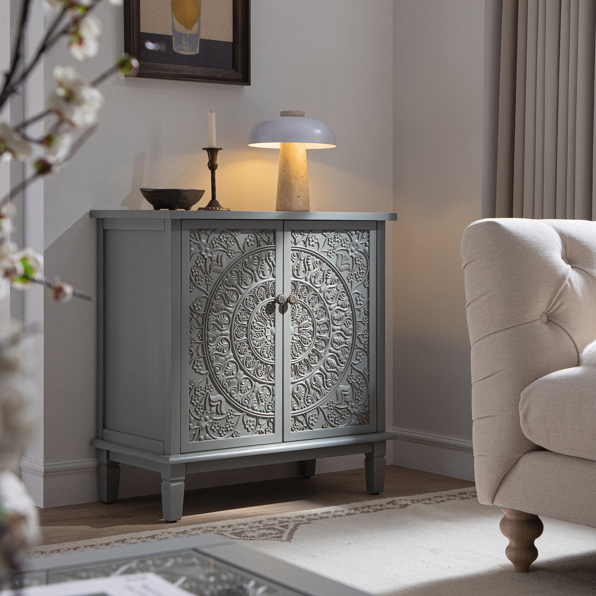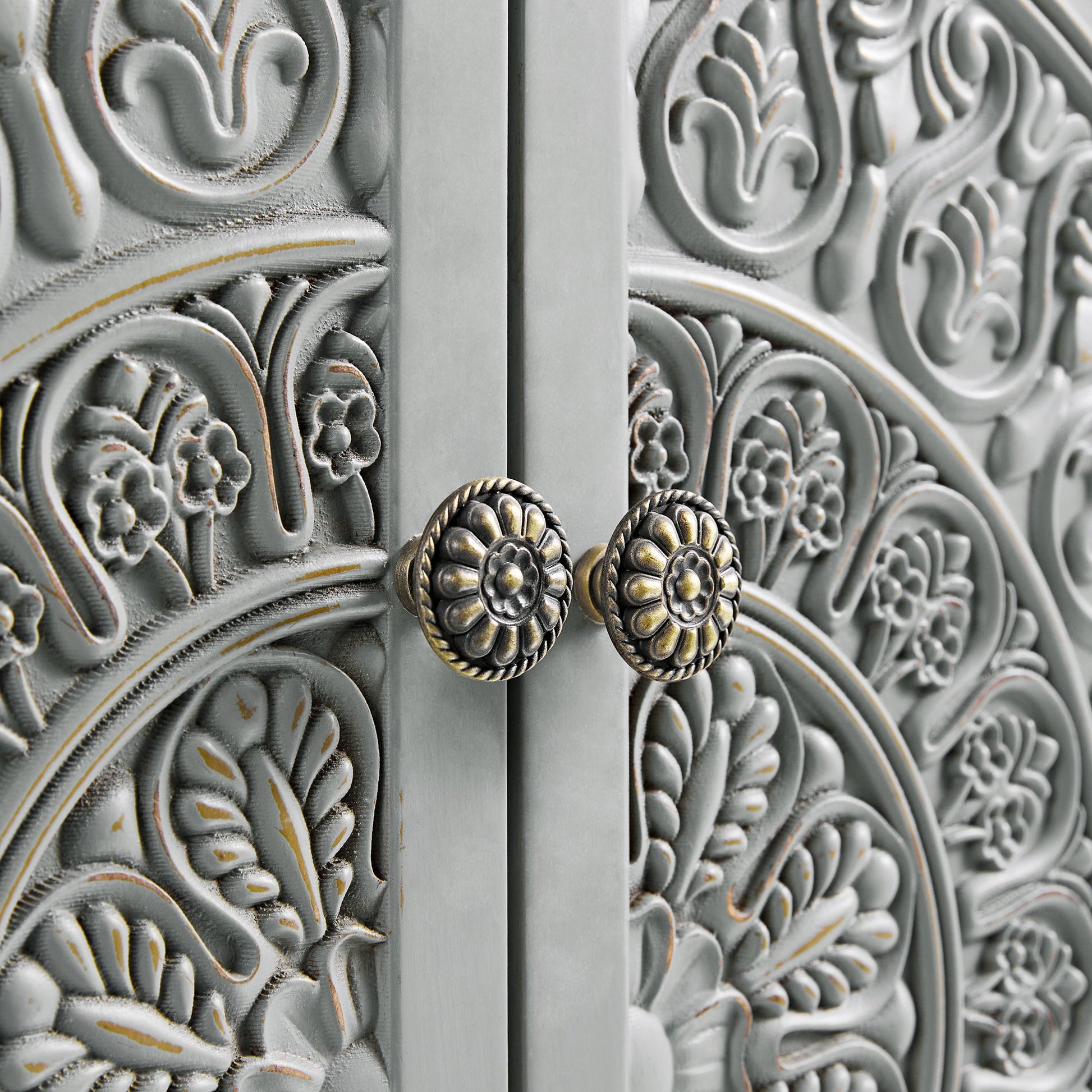 - Les façades de portes sculptées forment un motif de mandala saisissant, tandis que la finition gris moyen et les bords légèrement vieillis offrent une palette calme et sophistiquée qui fonctionne à merveille dans les intérieurs rustiques, classiques ou neutres modernes.