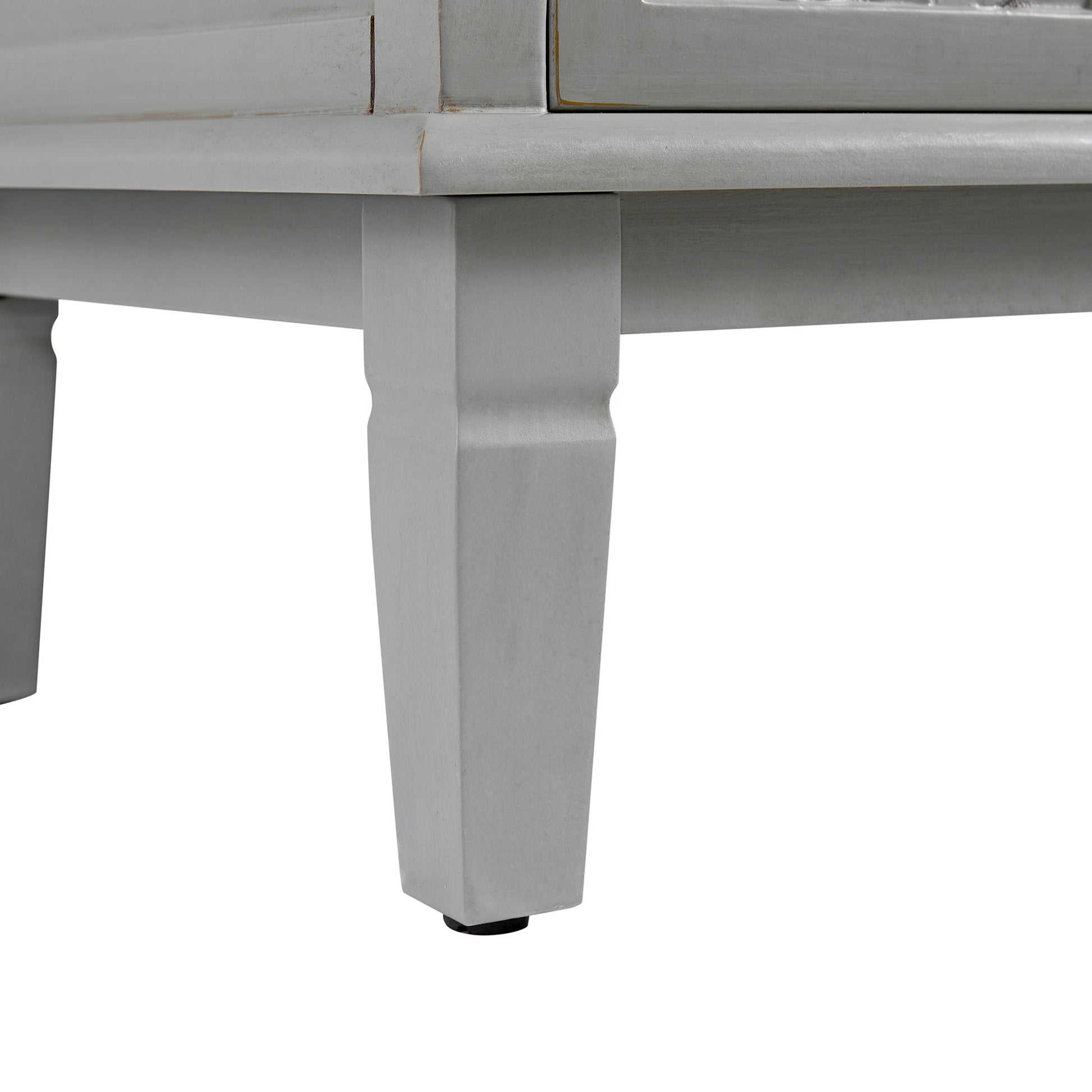 - Chaque tiroir est équipé de boutons en laiton, ajoutant un charme d'inspiration antique à la surface sculptée.