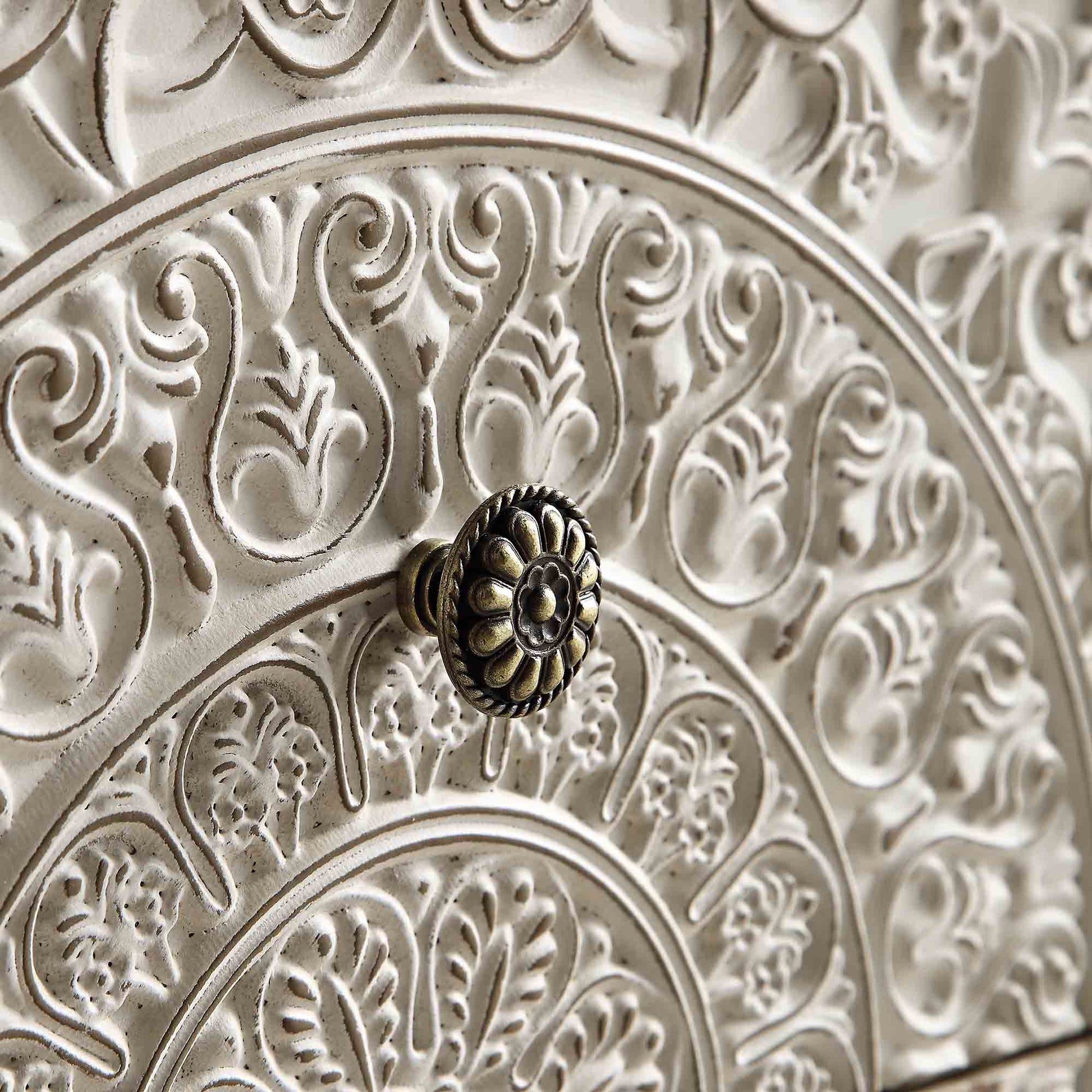 - De magnifiques façades de tiroirs sculptées sont associées à des poignées en laiton antique à motifs floraux pour un look bohème chic.