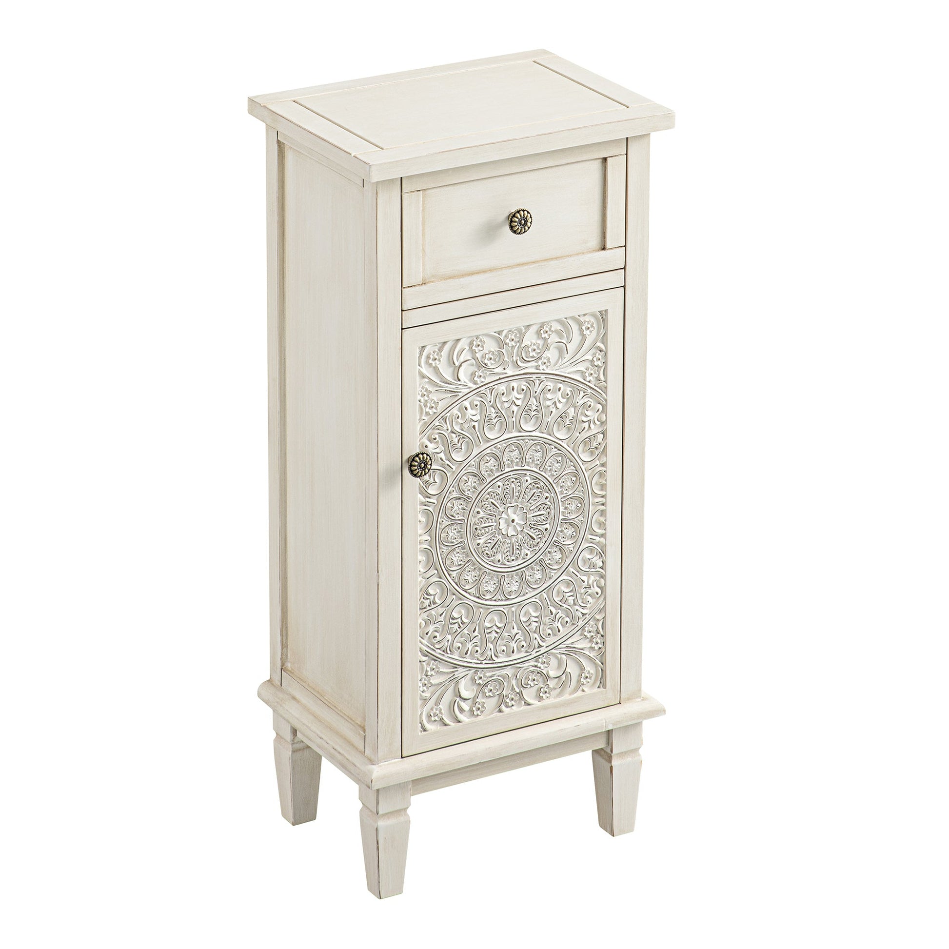- Notre armoire de salle de bain Chantilly est dotée d'une porte d'armoire sculptée à motif floral, avec une finition à effet blanchi à la chaux.