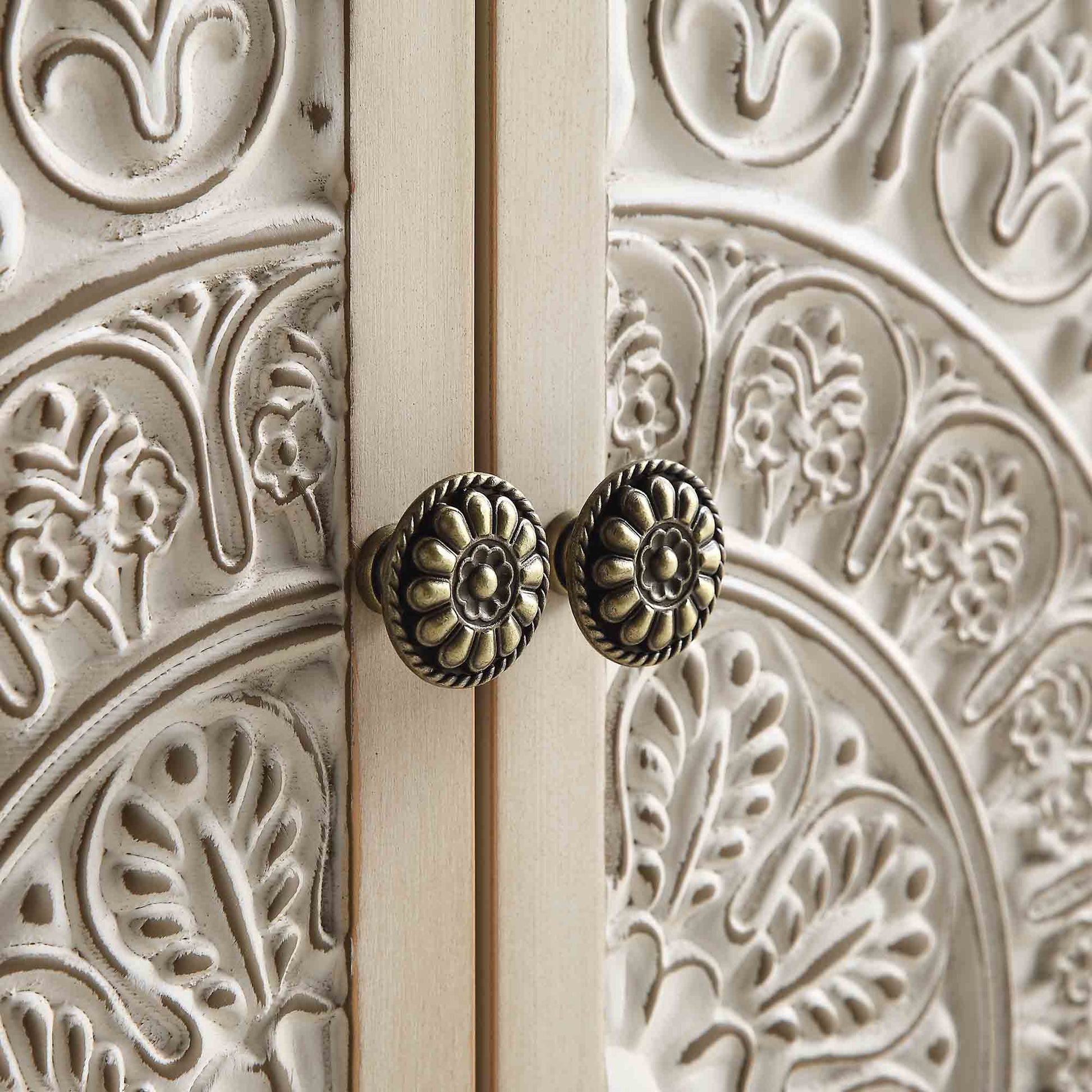 - Les poignées en laiton antique à motifs floraux complètent le motif floral sculpté.