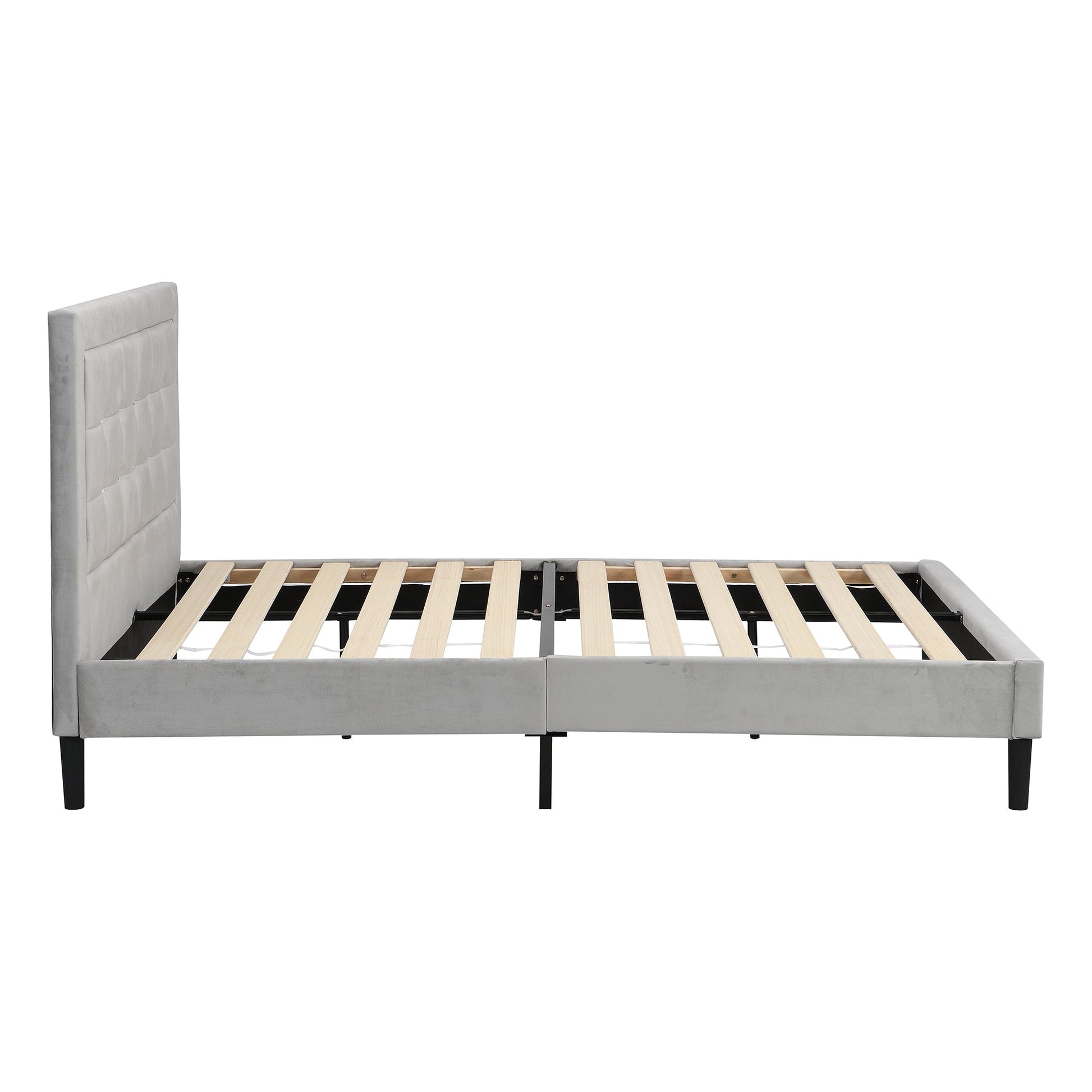 - La tête de lit capitonnée est boutonnée avec des détails en dimante, sommier à lattes en bois à ressorts inclus.