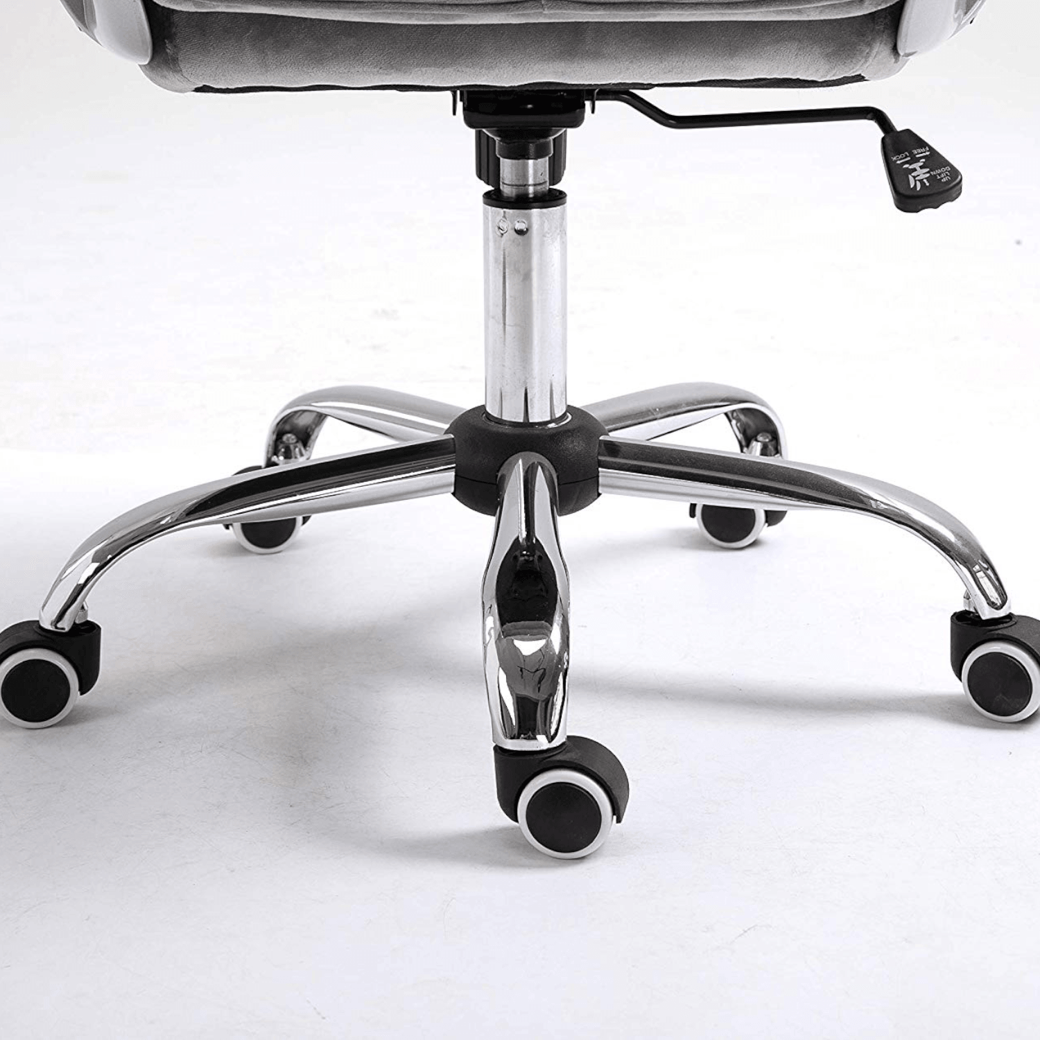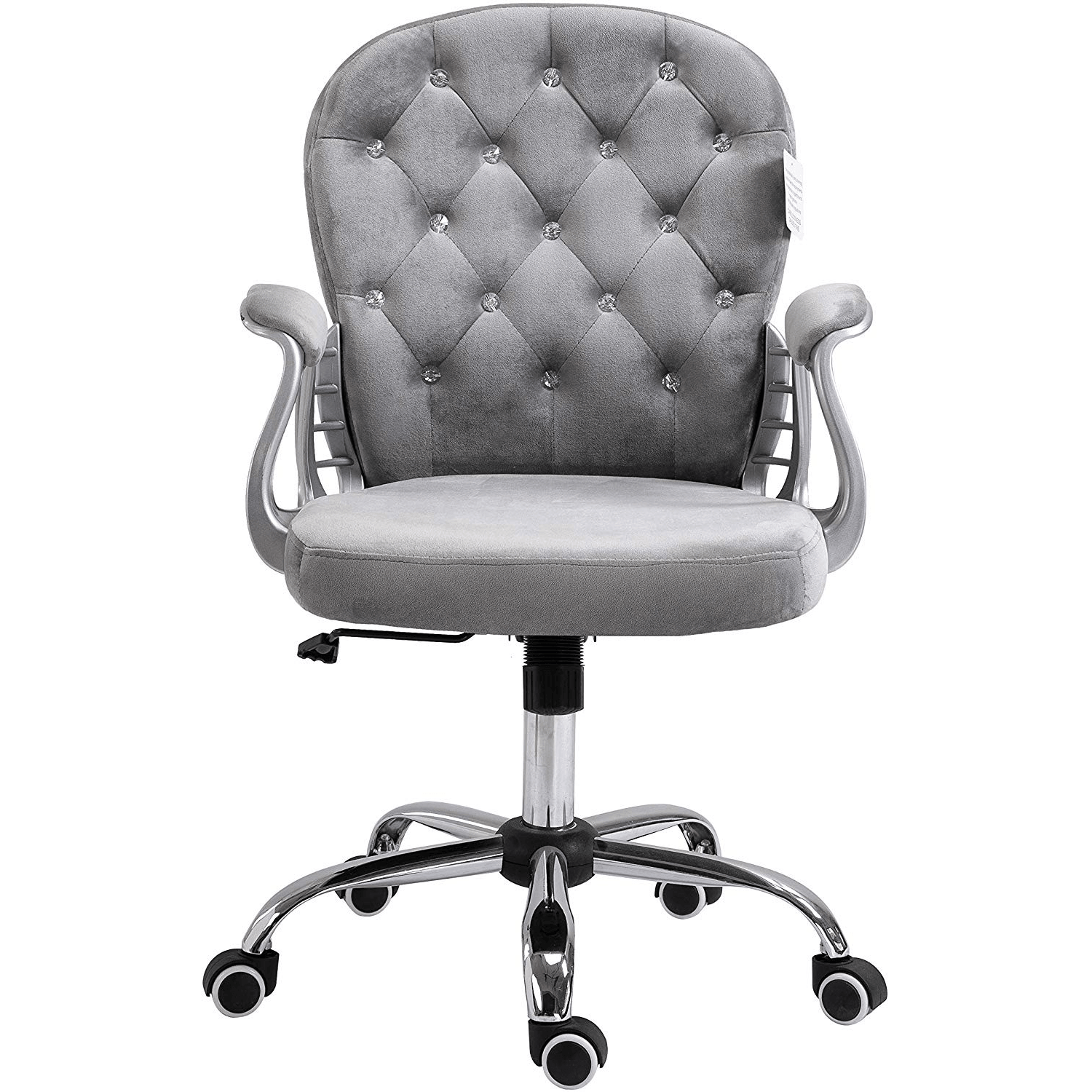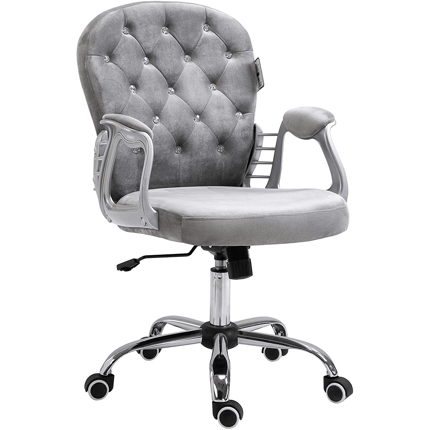 - Cette chaise de bureau élégante est dotée d'un dossier boutonné en diamant et d'un revêtement en velours gris moelleux.