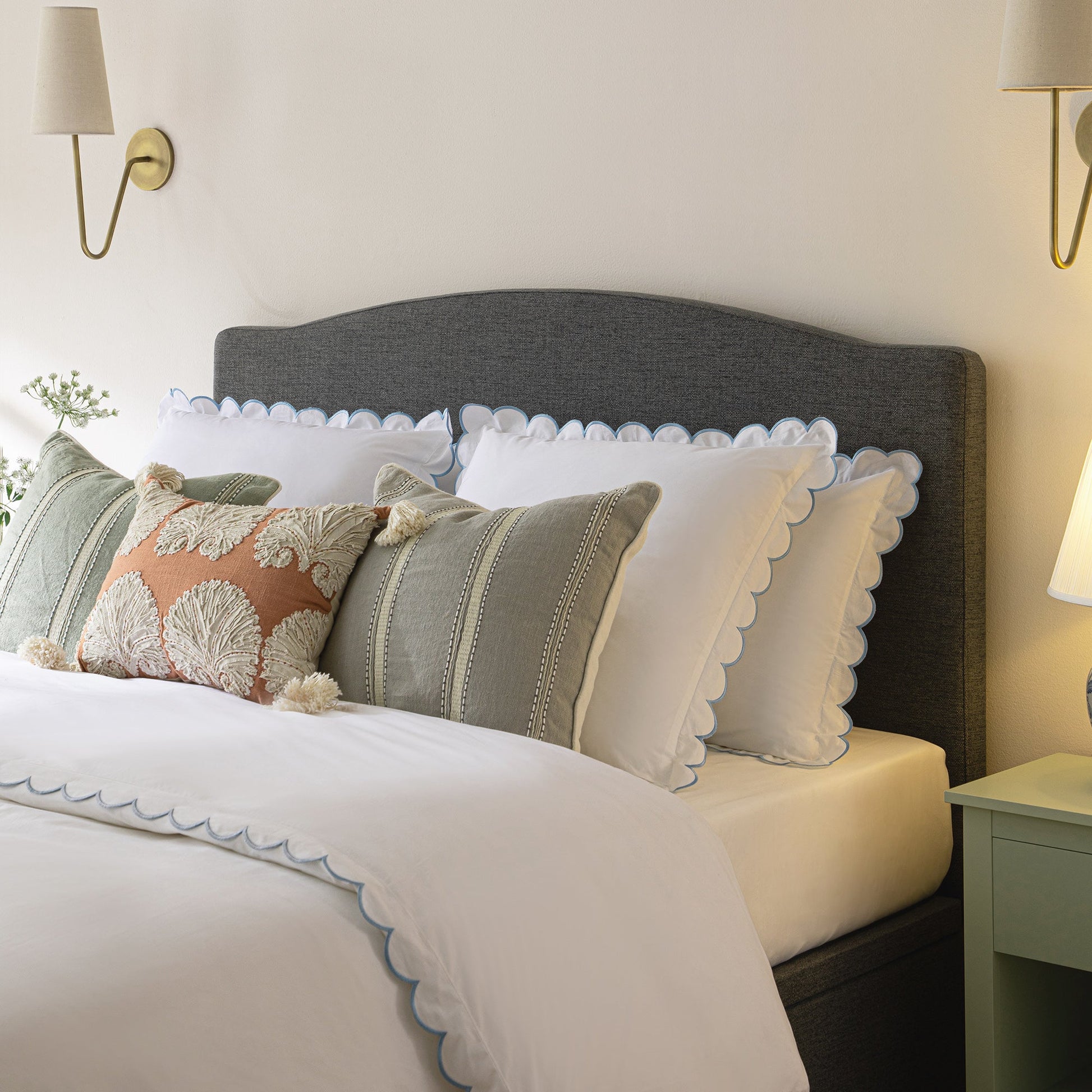 Complétez le look : sur la photo avec le lit de rangement ottoman rembourré gris foncé Chilworth se trouvent notre coussin à motif appliqué Aubrey Suzani , notre coussin vert à rayures Pembroke 100 % lin , notre tapis en laine tissé à la main à bordure festonnée bleue Matilda , notre table de chevet Oakham Desert Sage et notre ensemble de couette festonnée brodée bleue Margot Bluebell .