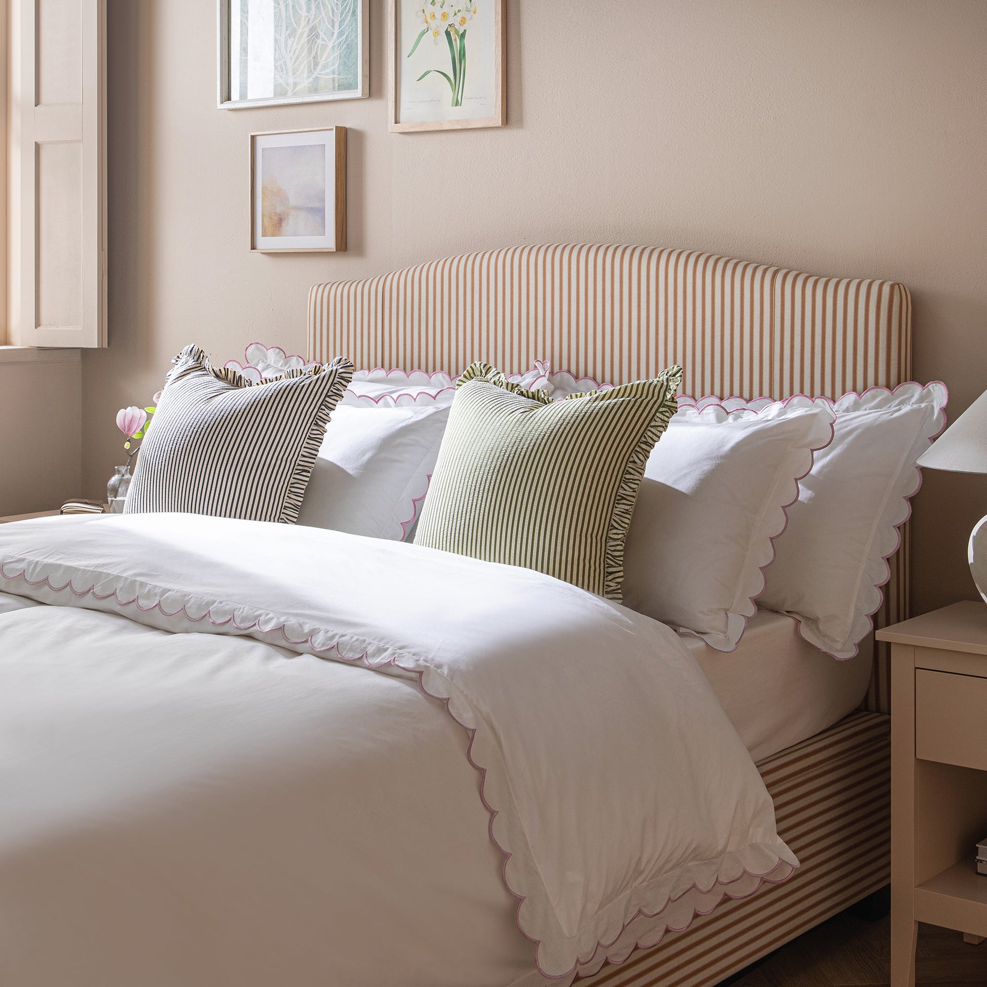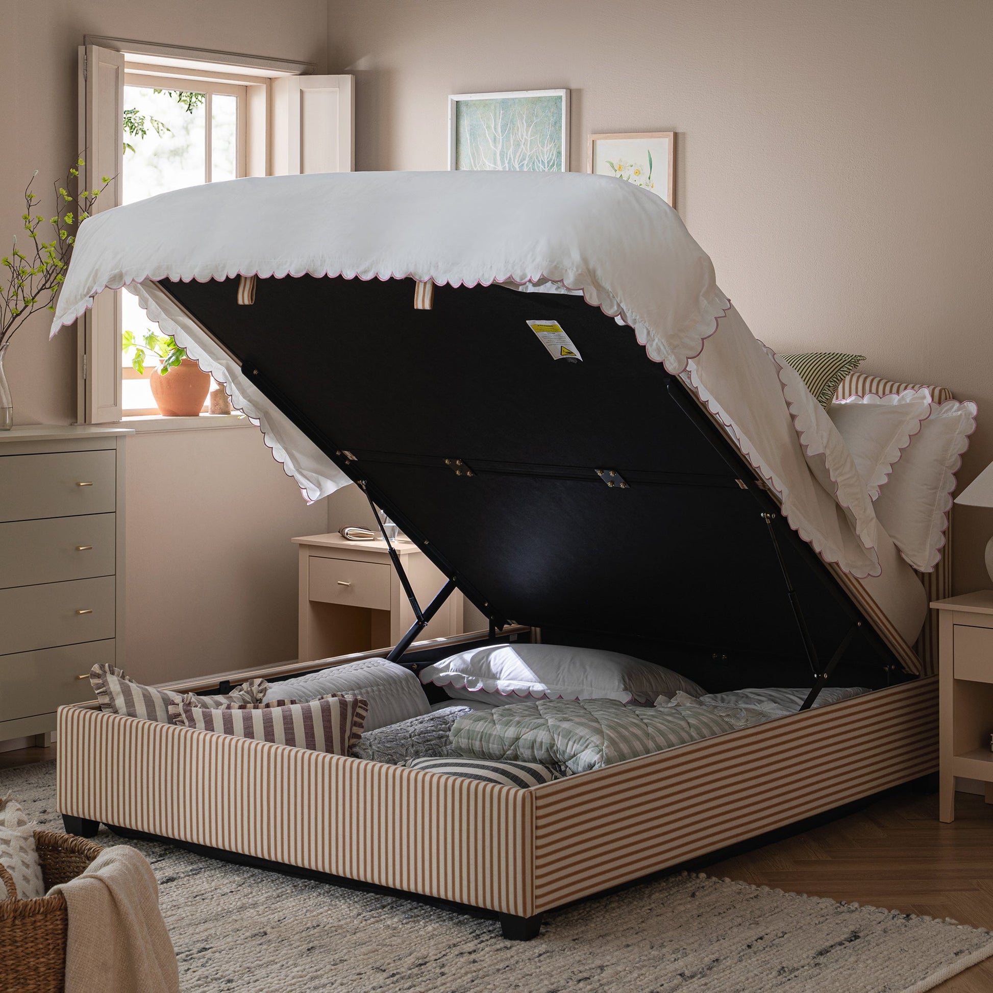 - Complétez le look : sur la photo avec le lit de rangement ottoman rembourré à rayures ocres Chilworth, nous trouvons notre tapis en laine tissé à la main gris clair Indra , la parure de couette brodée rose festonnée Margot Rose , la commode à 4 tiroirs blanche ombragée Oakham , la table de chevet rose nude Oakham et le coussin à volants en seersucker à rayures Iris Ticking en noir et vert .