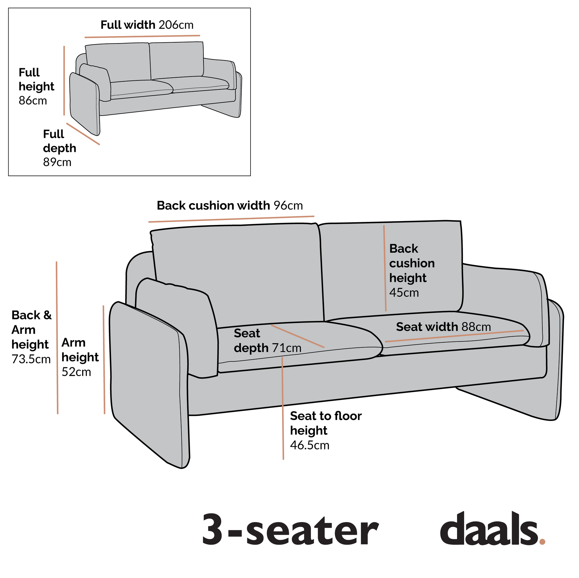 - Dimensions du canapé 3 places : L 206 x P 89 x H 86 cm