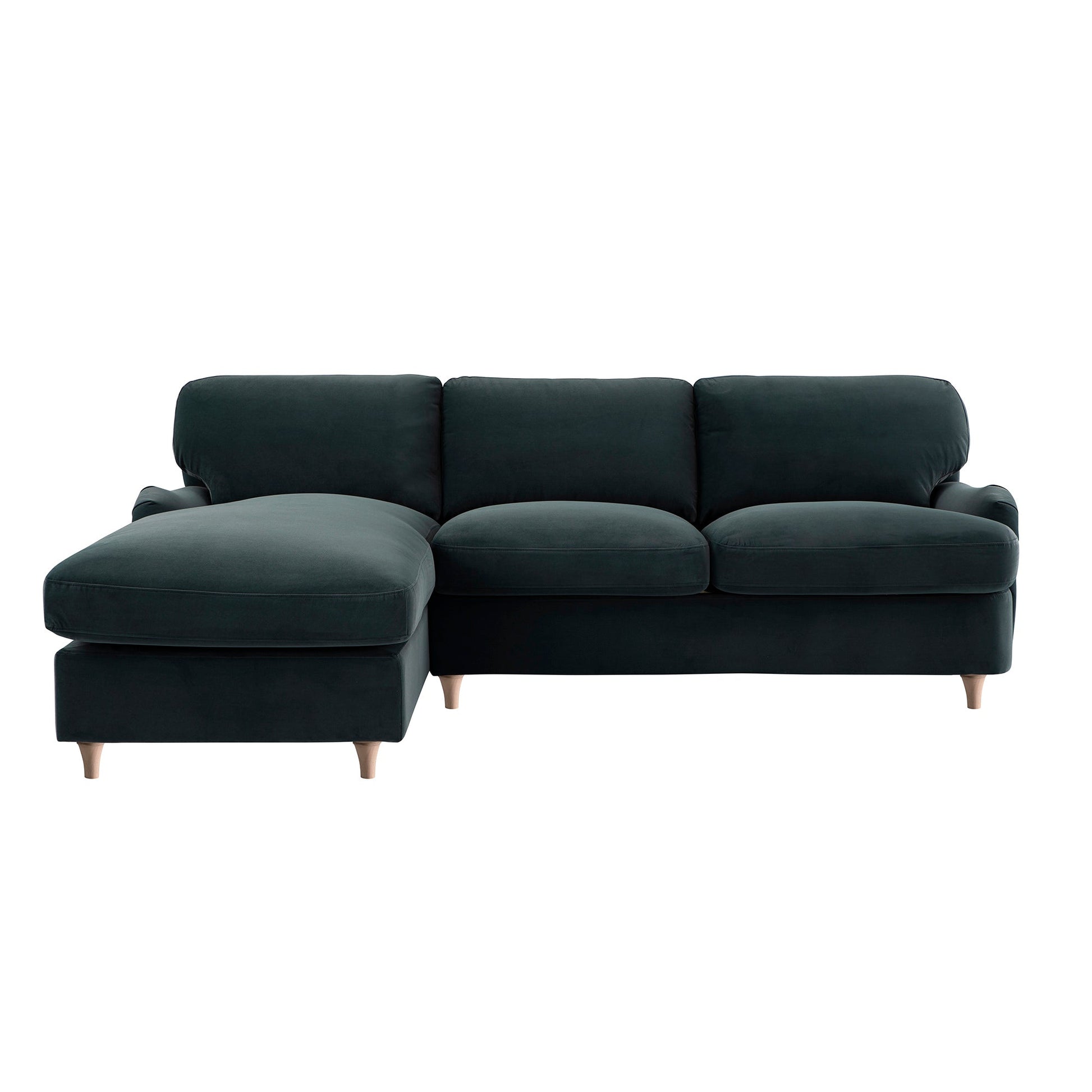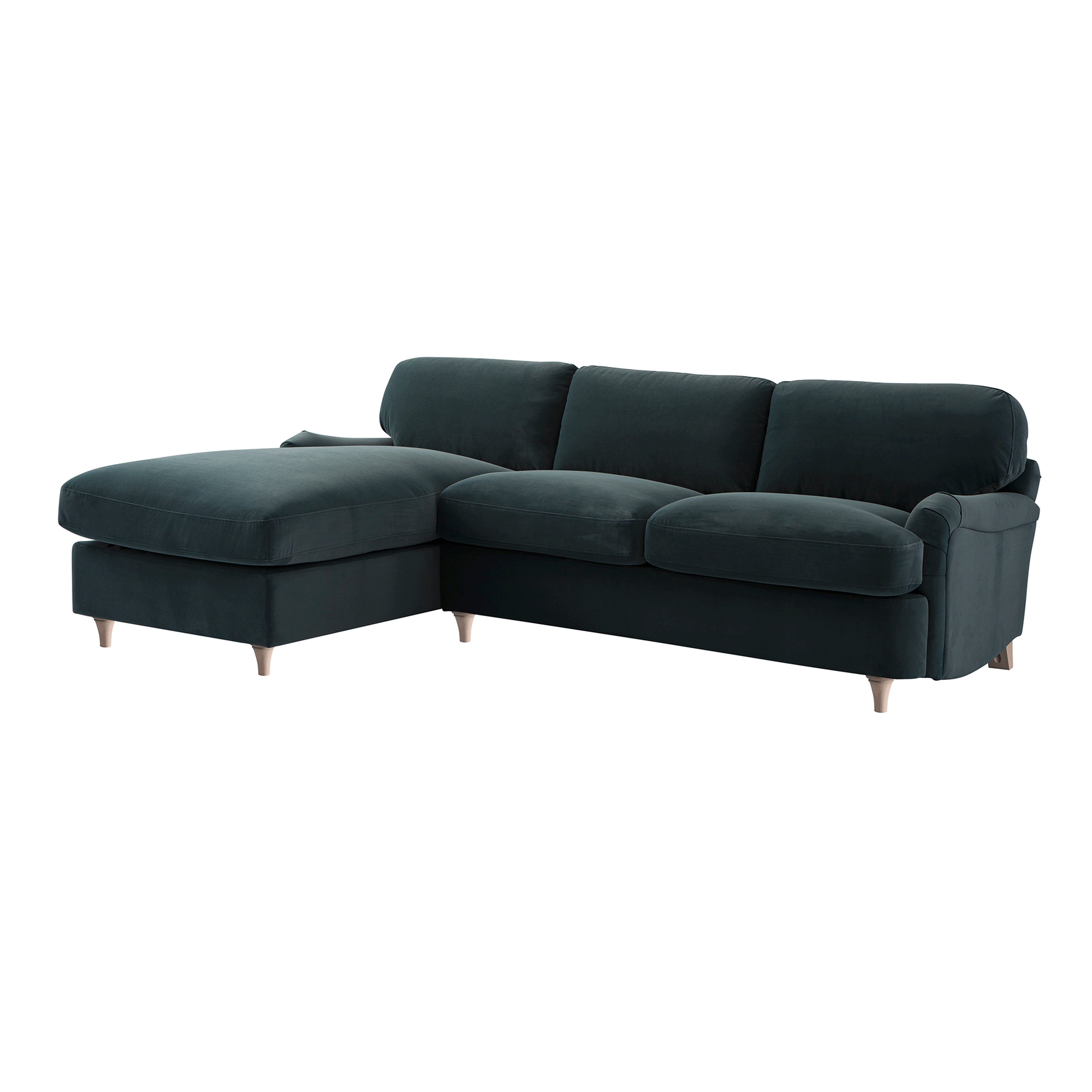 Canapé-lit Daphnis en velours bleu égéen, grande méridienne orientée à gauche