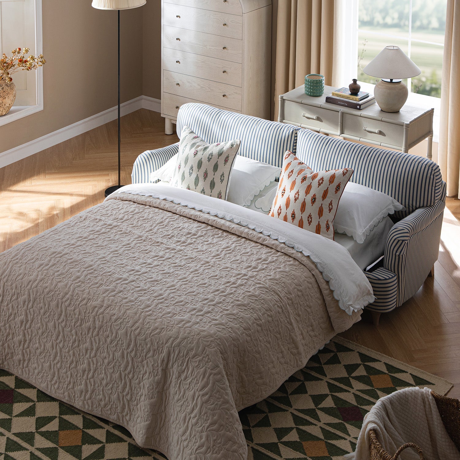 - Spacieux, polyvalent et plein de charme, notre grand canapé-lit 3 places Daphnis en tissu mélangé de lin à rayures bleues offre à la fois confort et praticité.