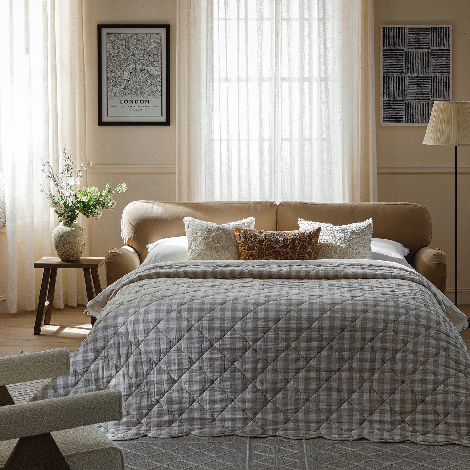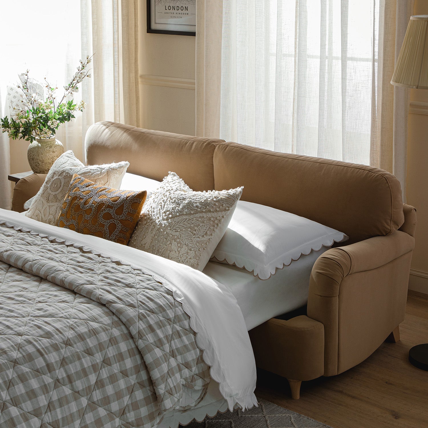 Complétez le look : sur la photo avec le canapé-lit en velours camel Daphnis se trouvent notre couvre-lit matelassé festonné vichy beige Matilda , la parure de couette festonnée brodée taupe Margot , le coussin Rosanna de Maison Neutral , le coussin en velours de coton abricot perlé à la main Luxe Orla , le coussin brodé Josie à nœud français de Maison Neutral , le tapis gris acier tissé à la main Nyla Aztec , la commode noire à 3 tiroirs Maru et la chaise d'appoint en boucle beige Chinnor .