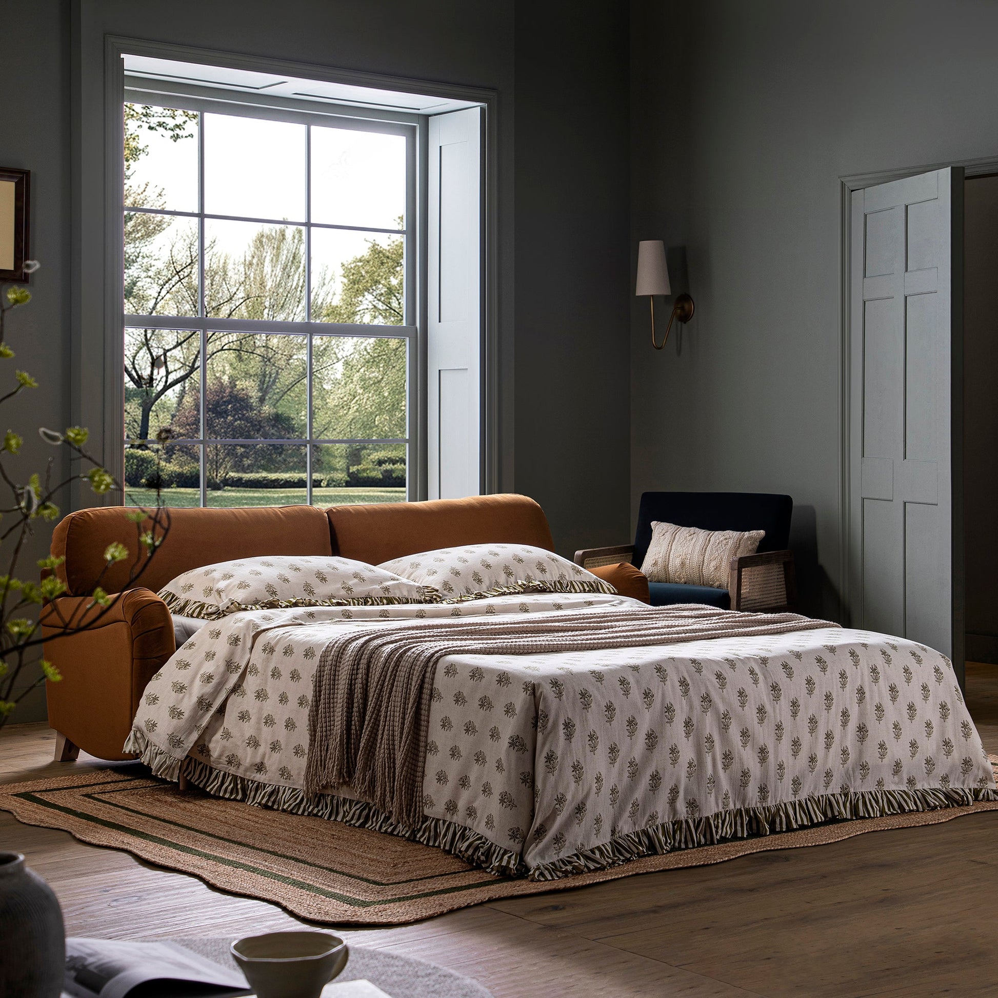 - Complétez le look : sur la photo avec le canapé-lit en velours cannelle Daphnis, nous voyons notre tapis rectangulaire en jute tressé à la main avec bordure festonnée verte Evie , le fauteuil en rotin avec cadre en chêne patiné en velours bleu égéen Fyne , le coussin brodé en dentelle de jute Sophia de Maison Neutral et l' ensemble de couette en mélange de lin à volants vert olive à fleurs Darcy .