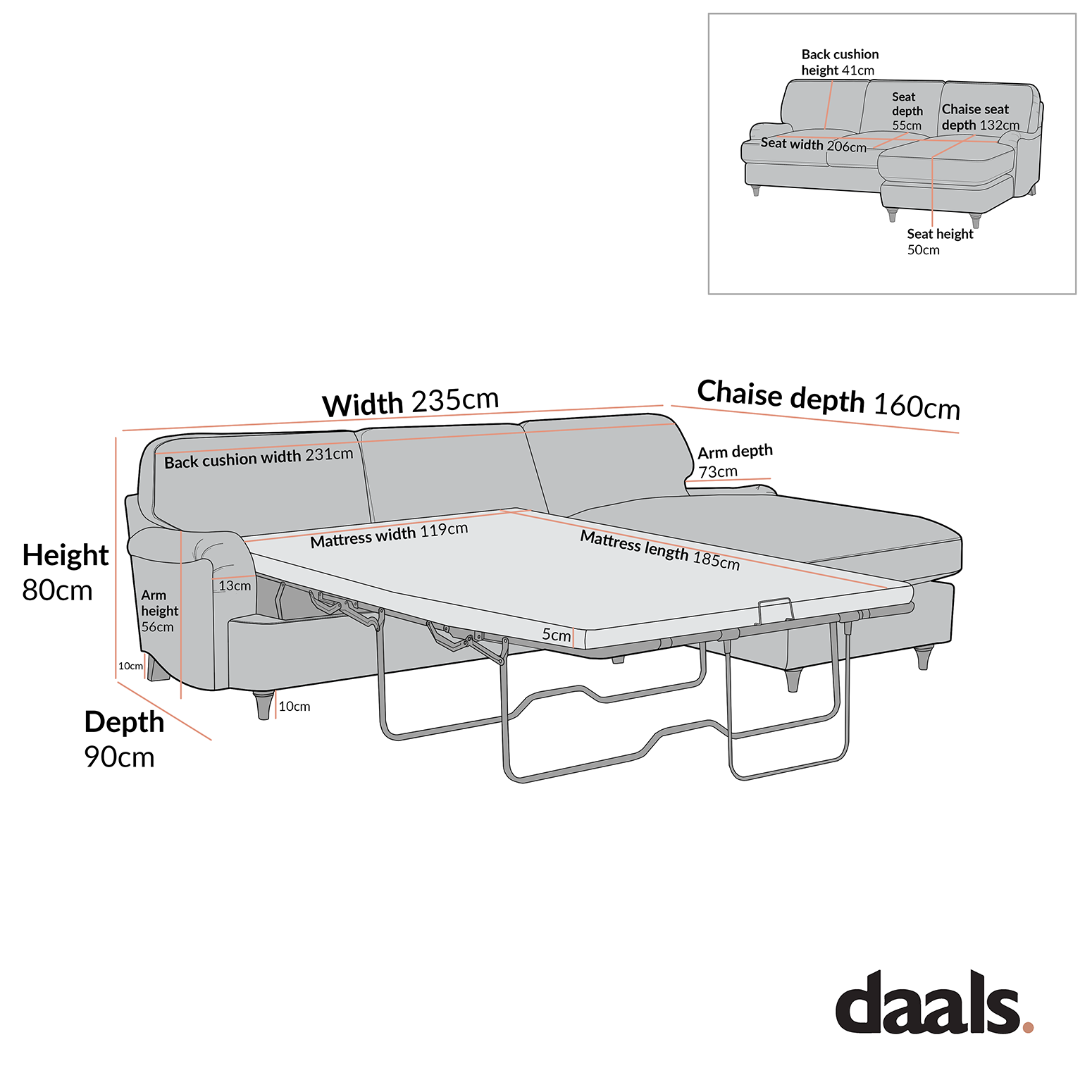 - Canapé-lit Grande Chaise Dimensions : L 235 x P 160 x H 80 cm.