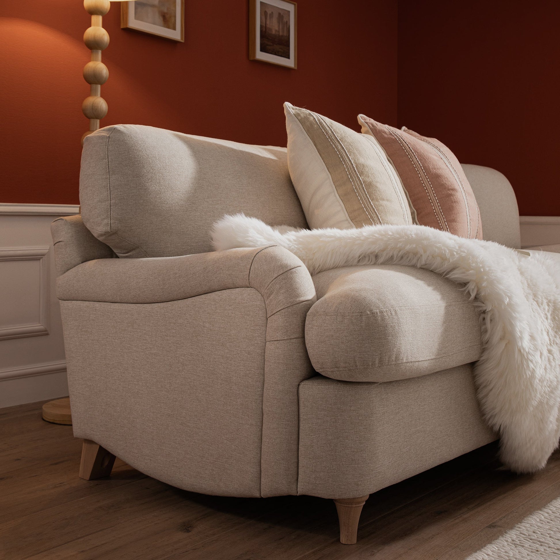 - Complétez le look : sur la photo avec le canapé-lit grande chaise longue en tissu avoine Daphnis, vous trouverez notre tapis en jute crème tressé à la main Aurora , le pouf de rangement rond en lin beige Amboise , le couvre-lit en lin mélangé matelassé festonné vichy beige Matilda et le coussin 100 % lin à rayures Pembroke en rose et avoine .