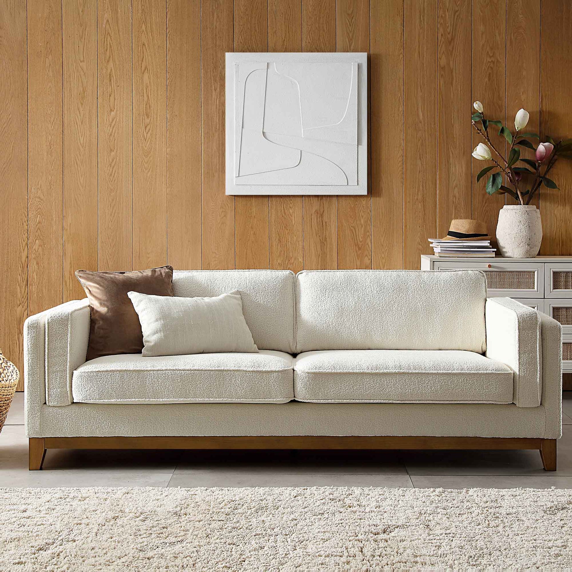 - Conçu avec des accoudoirs droits et une base en bois massif, le canapé est doté de coussins d'assise composés de ressorts et de mousse pour un espace de détente confortable.