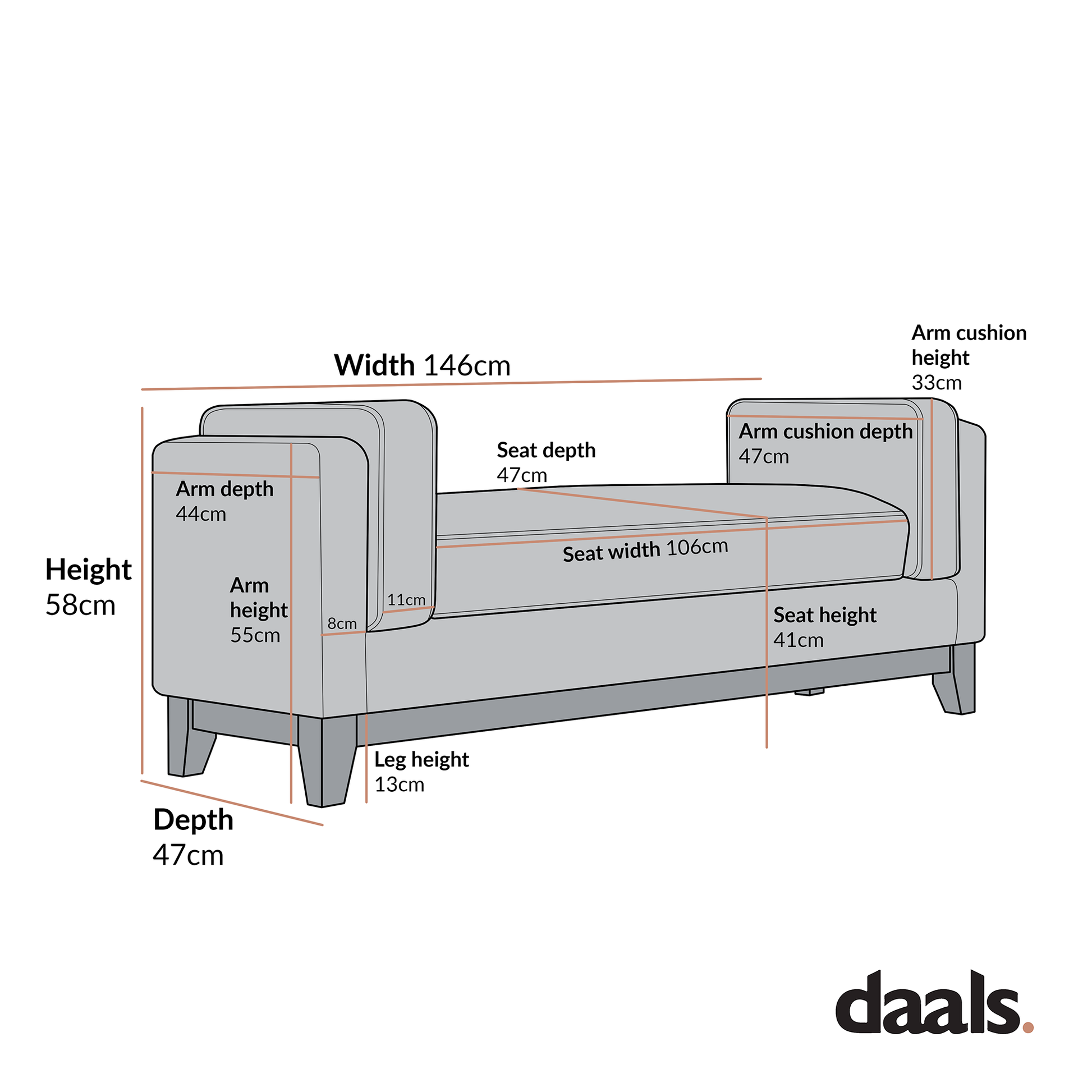 - Dimensions totales : L 146,0 x P 44,0 x H 58,0 cm