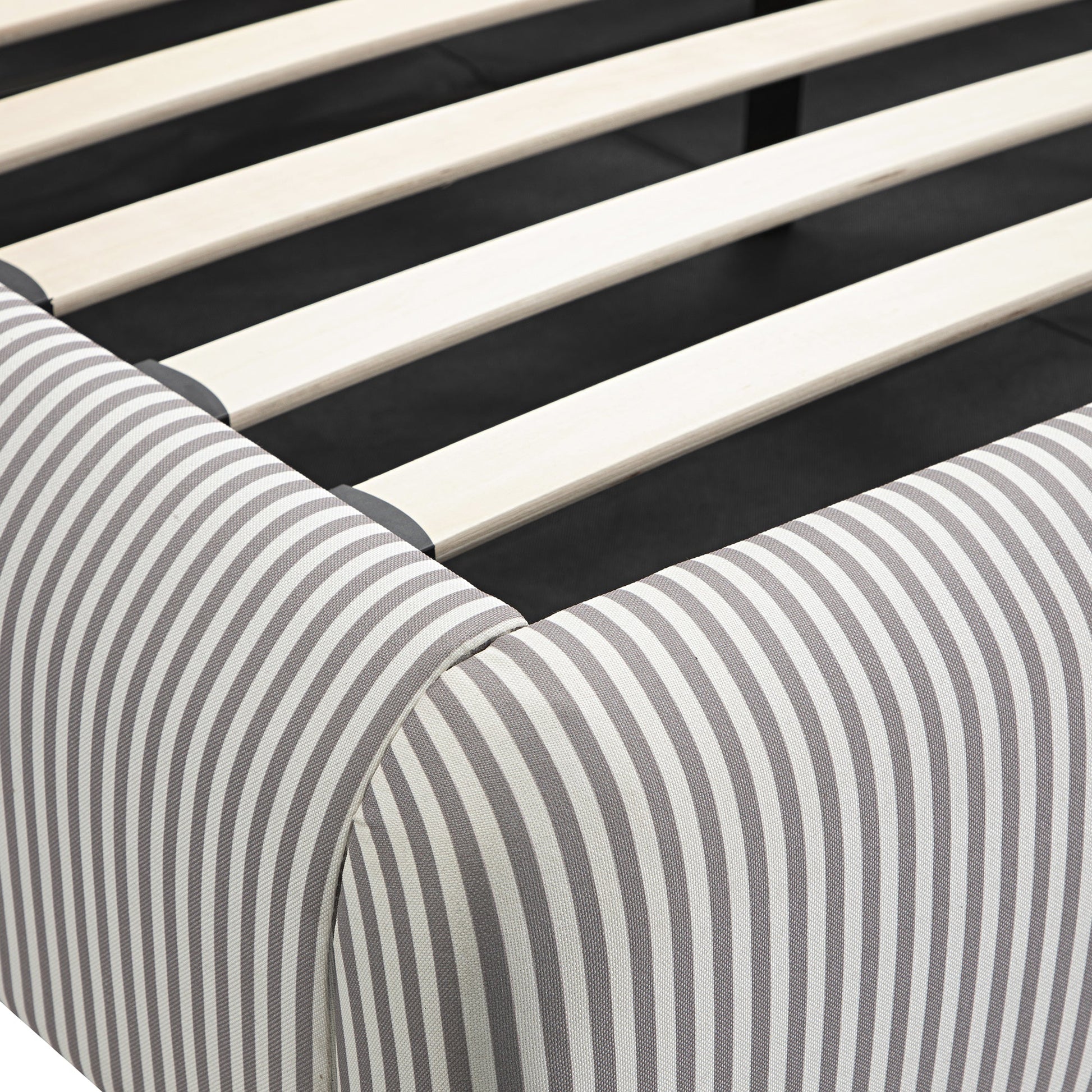 Lit coffre ottoman en tissu rayé taupe clair avec tête de lit incurvée Egerie