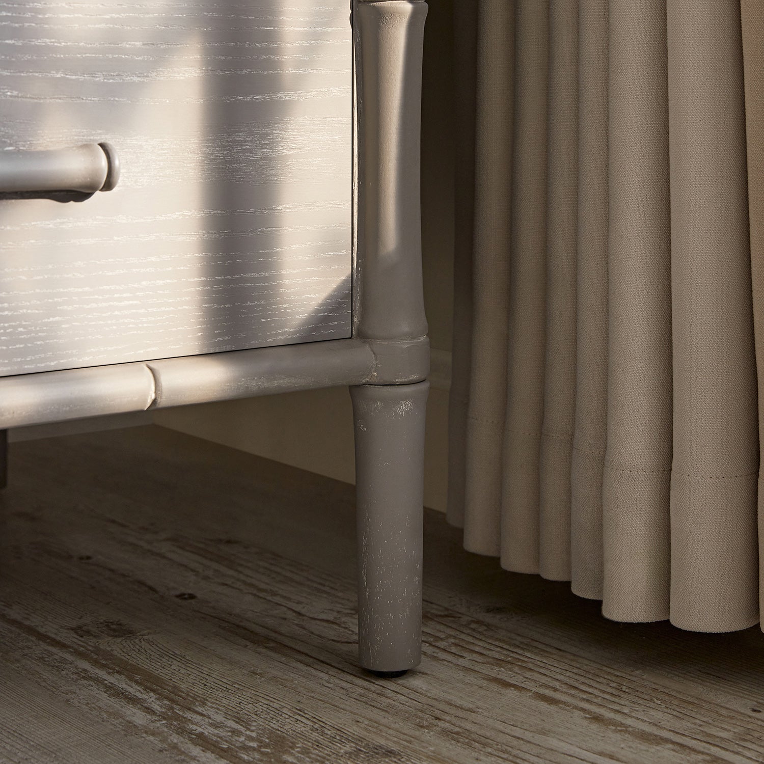 - Fabriquée à partir de placage de frêne massif, de pin massif et de MDF, chaque armoire est brossée à la main avec une peinture grise aux teintes chaudes , révélant subtilement le grain naturel du bois en dessous, soulignant le caractère unique et les variations naturelles du bois.