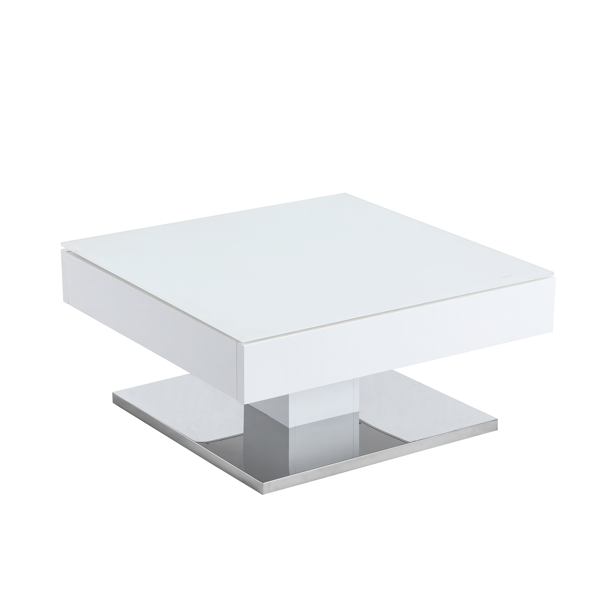 - Le plateau carré de la table basse est en verre trempé dépoli pour un rangement discret. La structure est recouverte d'une peinture PU blanche mate de haute qualité, assortie au plateau et au piètement argenté.