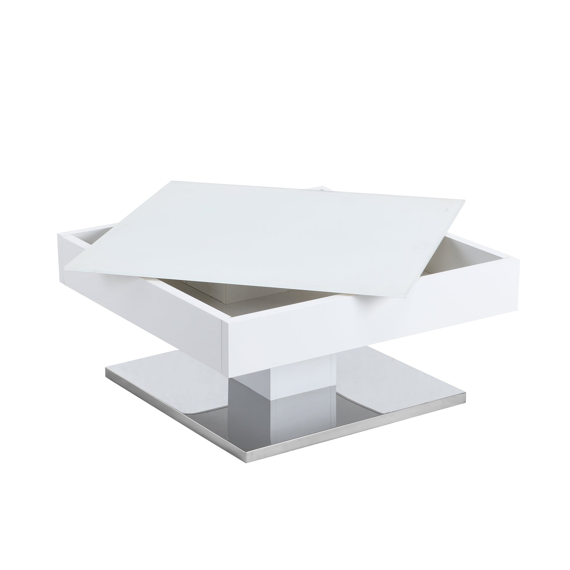 - Notre table basse Finch présente un magnifique design contemporain. Son plateau pivotant révèle un espace de rangement dissimulé. Son piètement en acier inoxydable brillant rehausse son esthétique et en fait un meuble idéal pour votre salon.