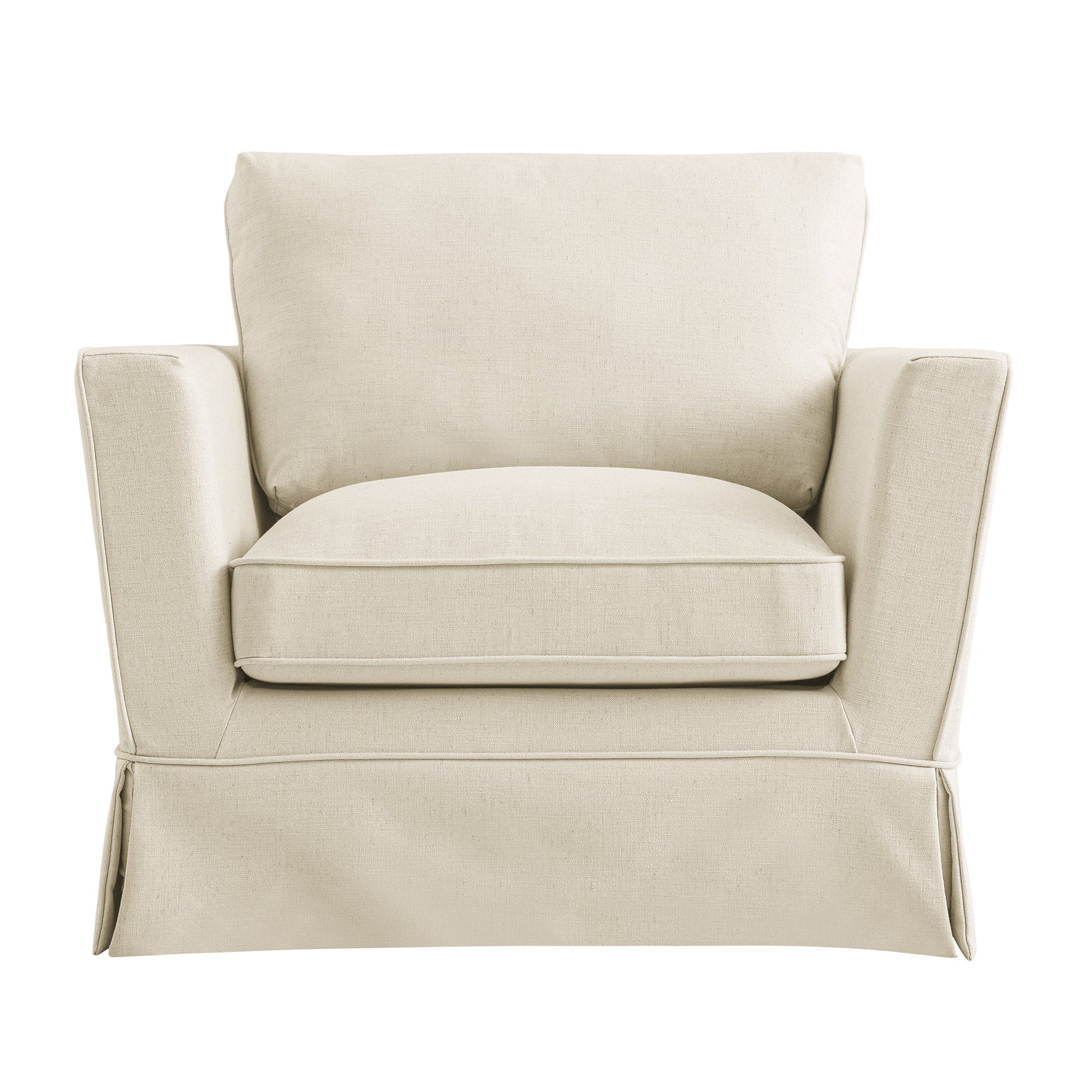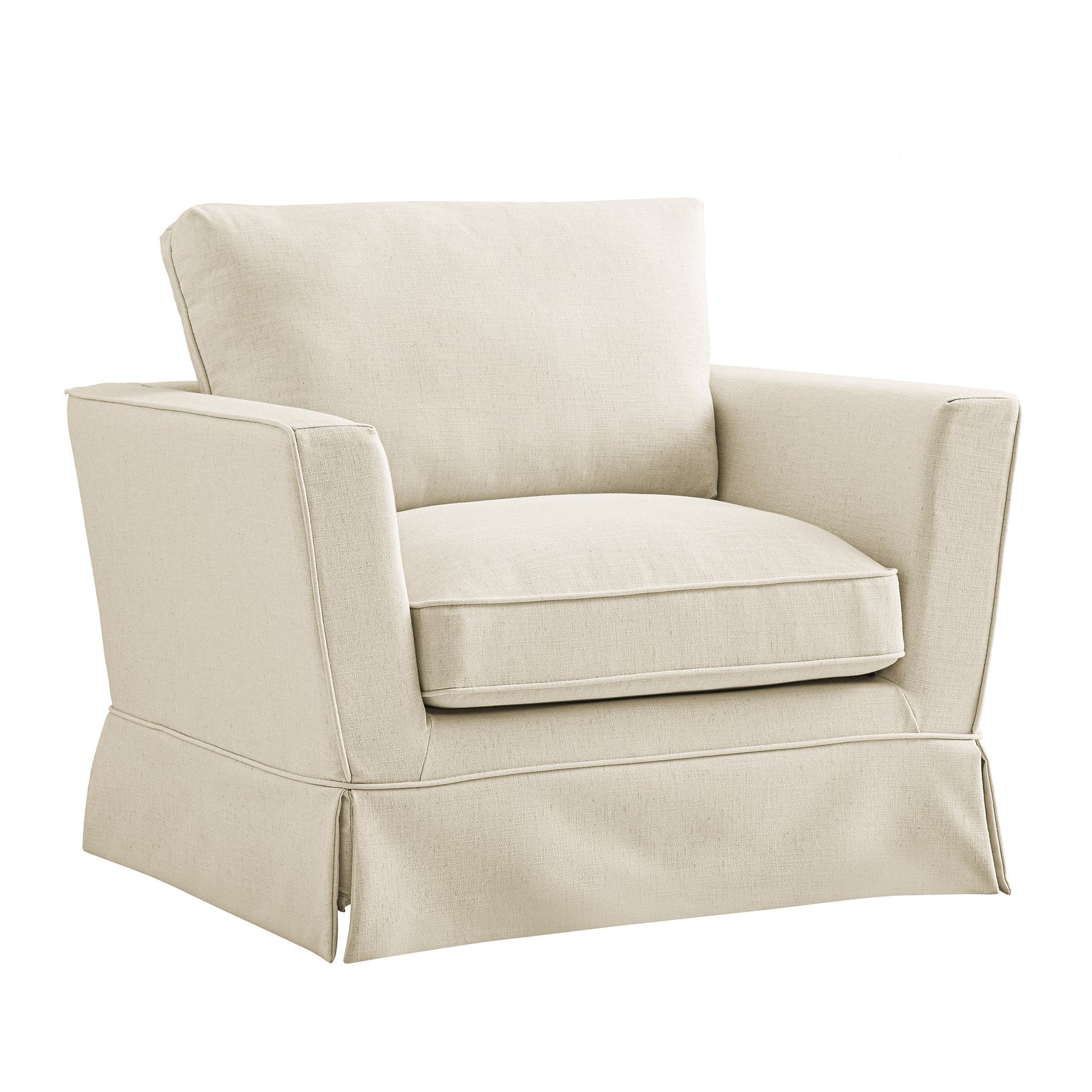 - Élégant et décontracté , notre fauteuil Fitz affiche un style classique avec une housse ample et des détails à jupe.