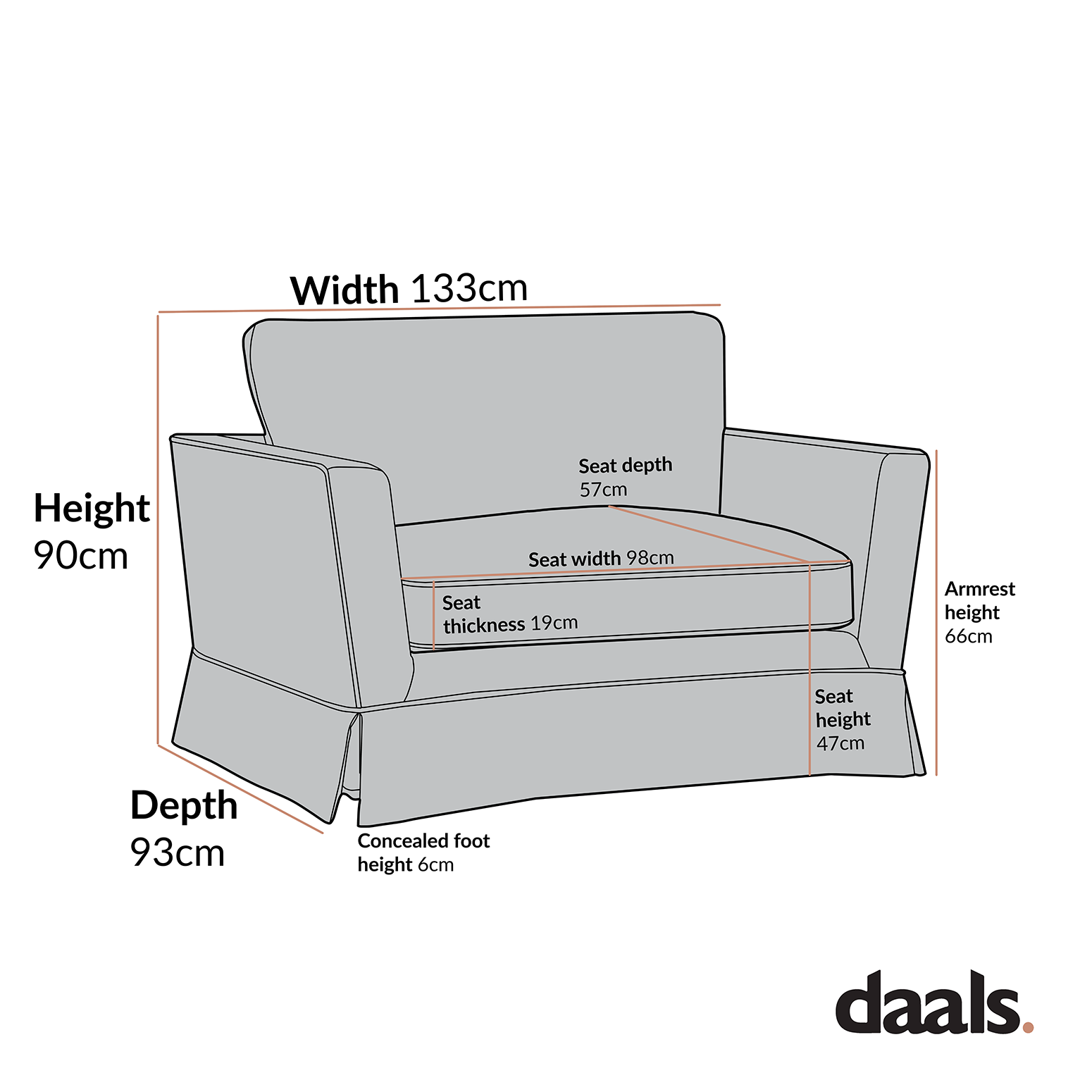 - Dimensions de la causeuse : L 133 x P 93 x H 90 cm.