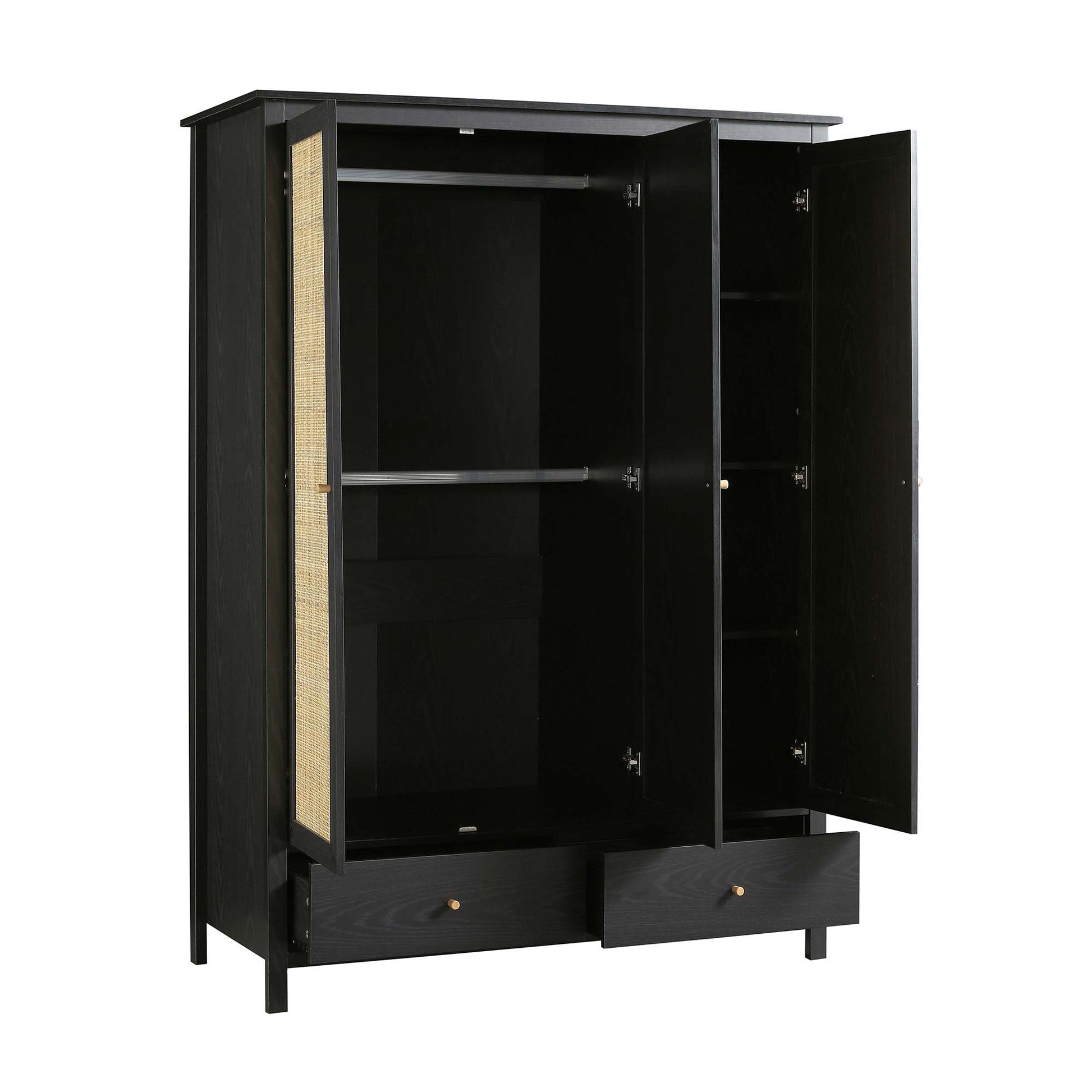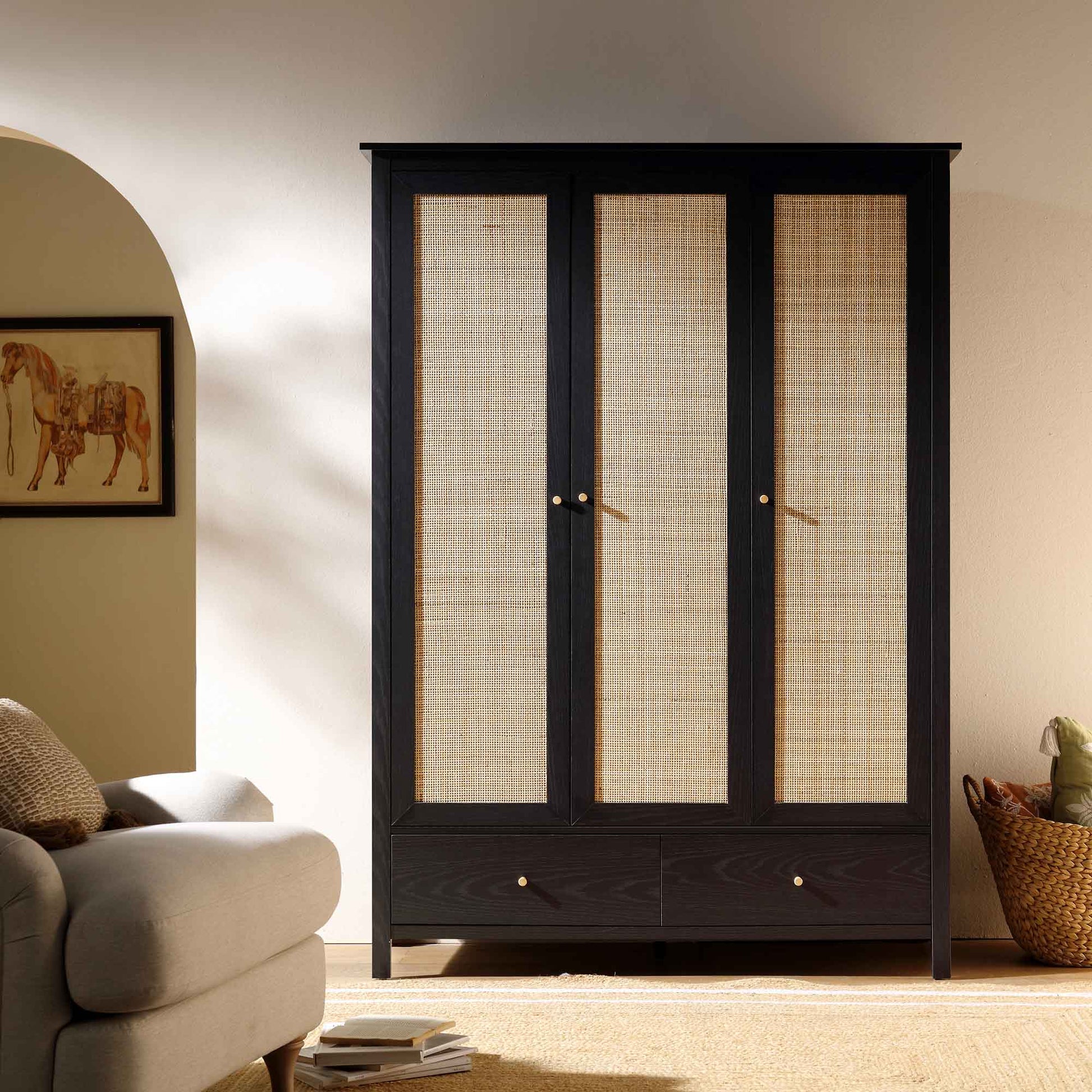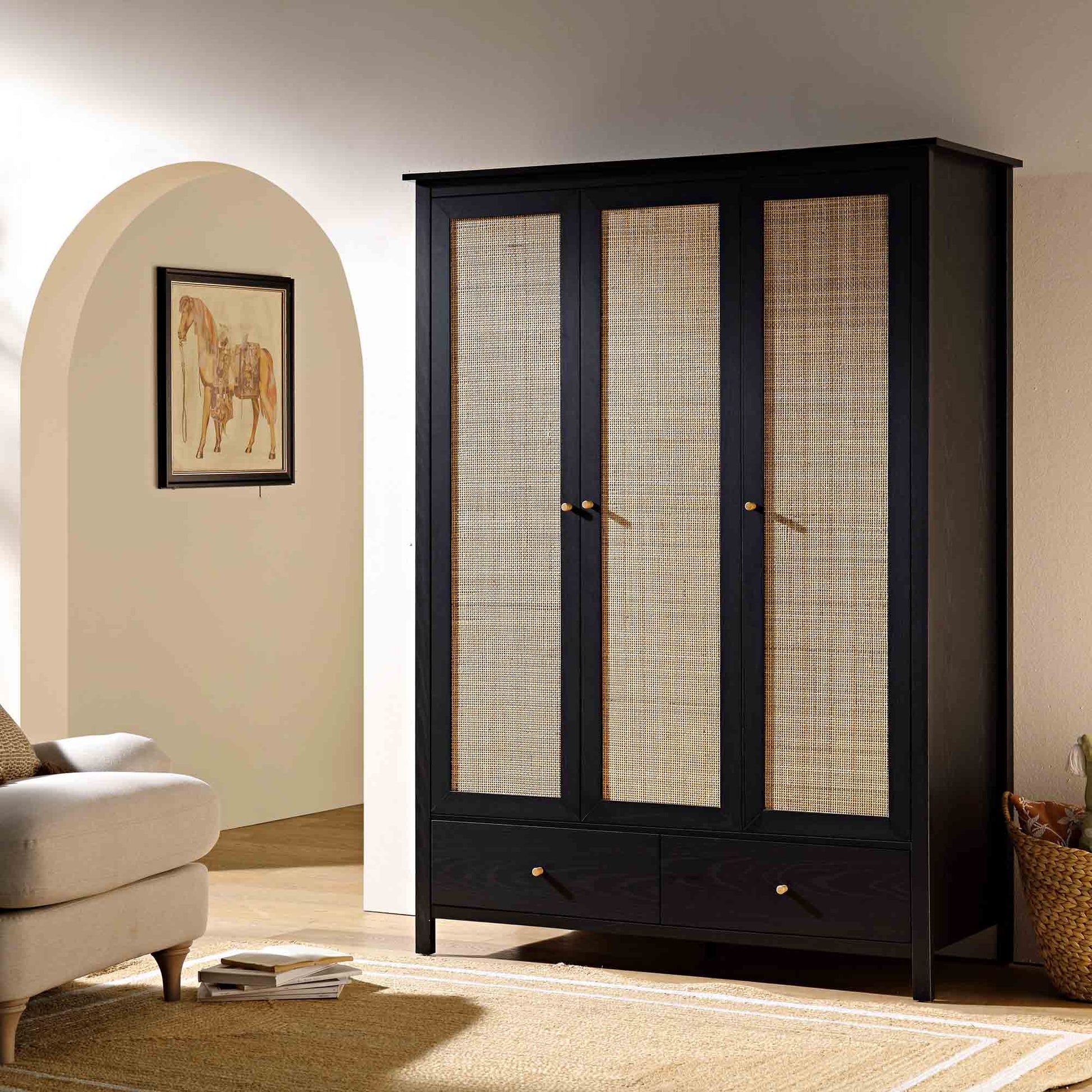 Armoire triple en rotin Frances avec 2 tiroirs, noire