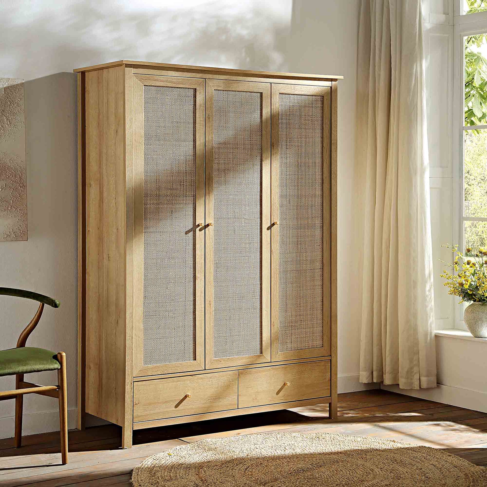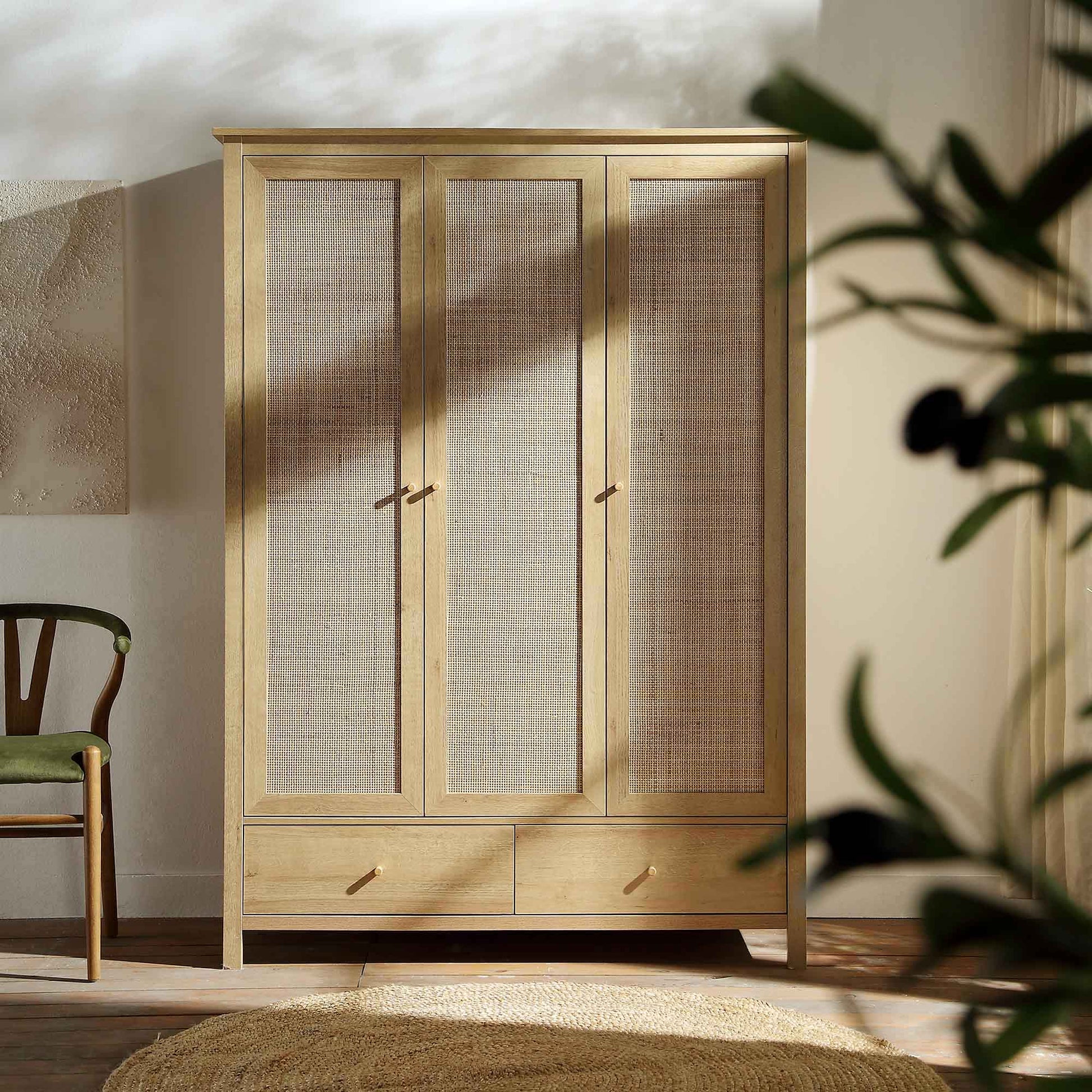 Armoire triple en rotin Frances avec 2 tiroirs, naturel