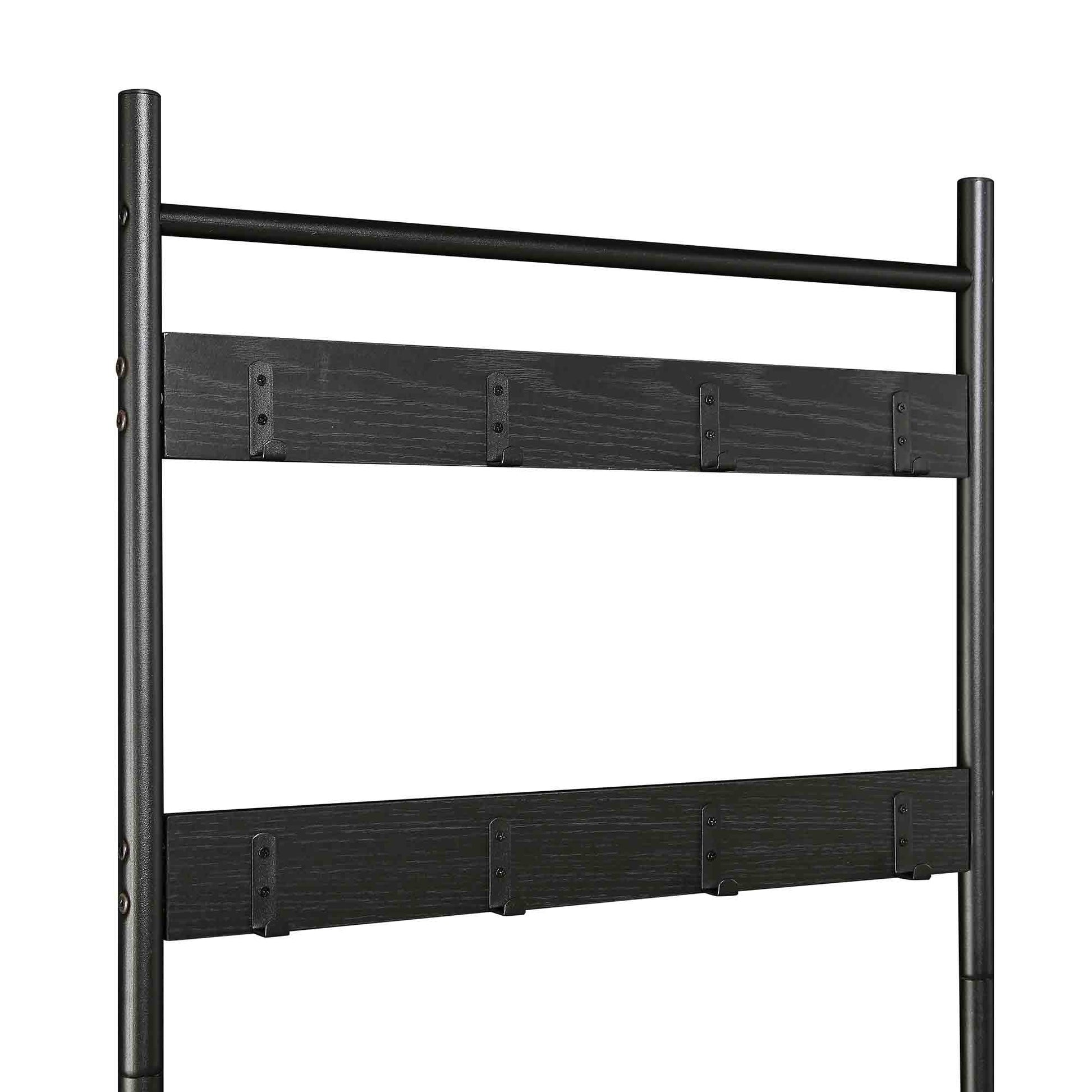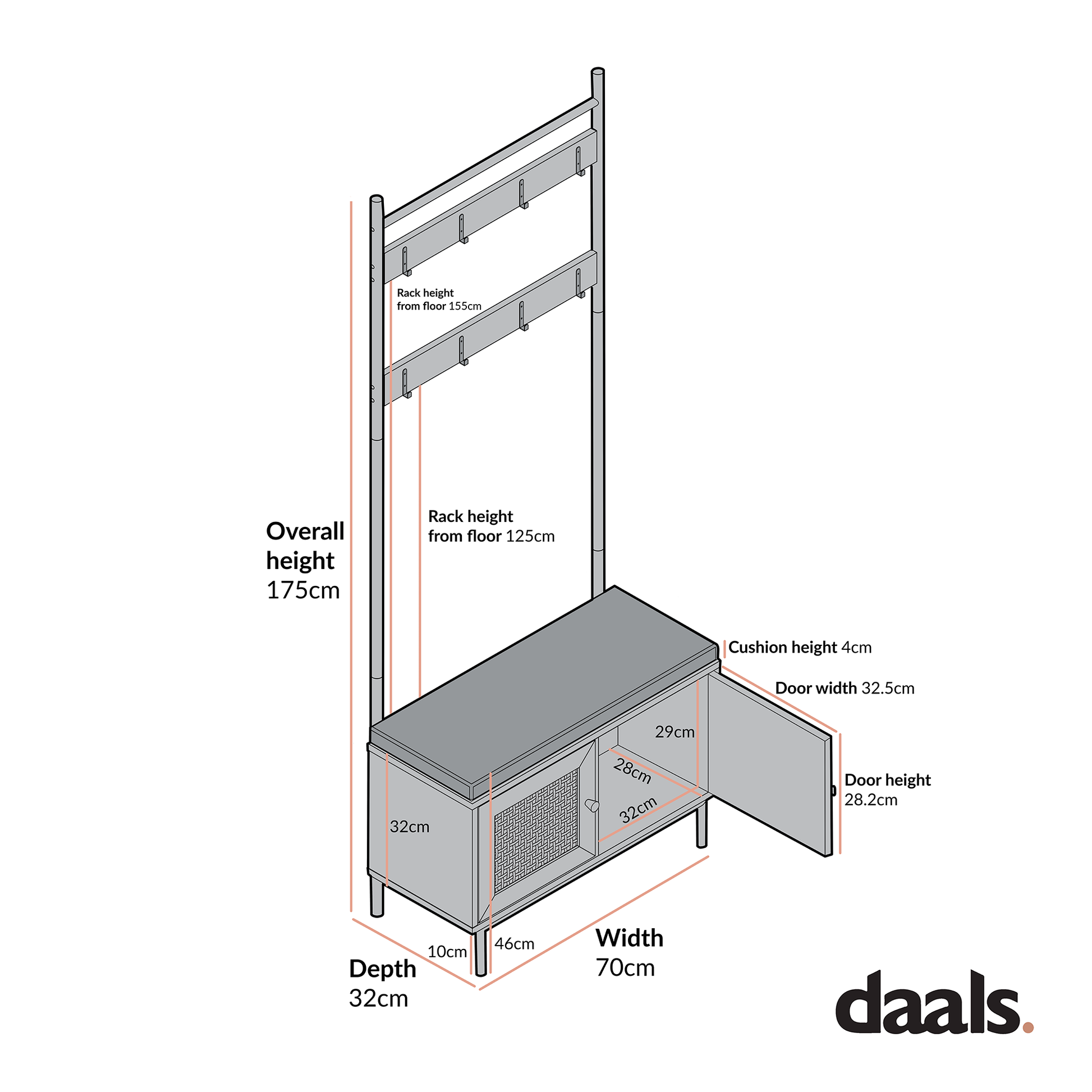 - L'unité offre un placard de rangement inférieur pour ranger les chaussures, ainsi que 8 crochets sur le dessus pour suspendre manteaux, chapeaux, écharpes et autres accessoires.