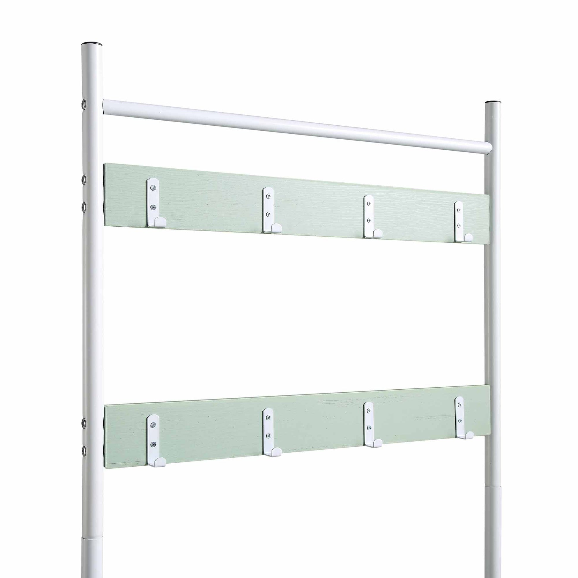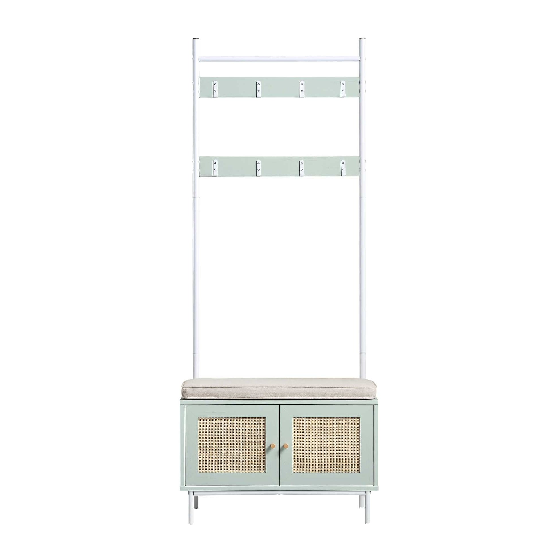 - L'unité offre un placard de rangement inférieur pour ranger les chaussures, ainsi que 8 crochets sur le dessus pour suspendre manteaux, chapeaux, écharpes et autres accessoires.