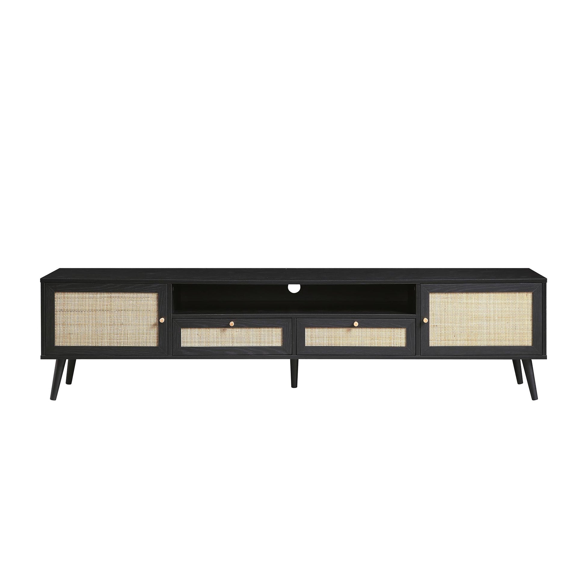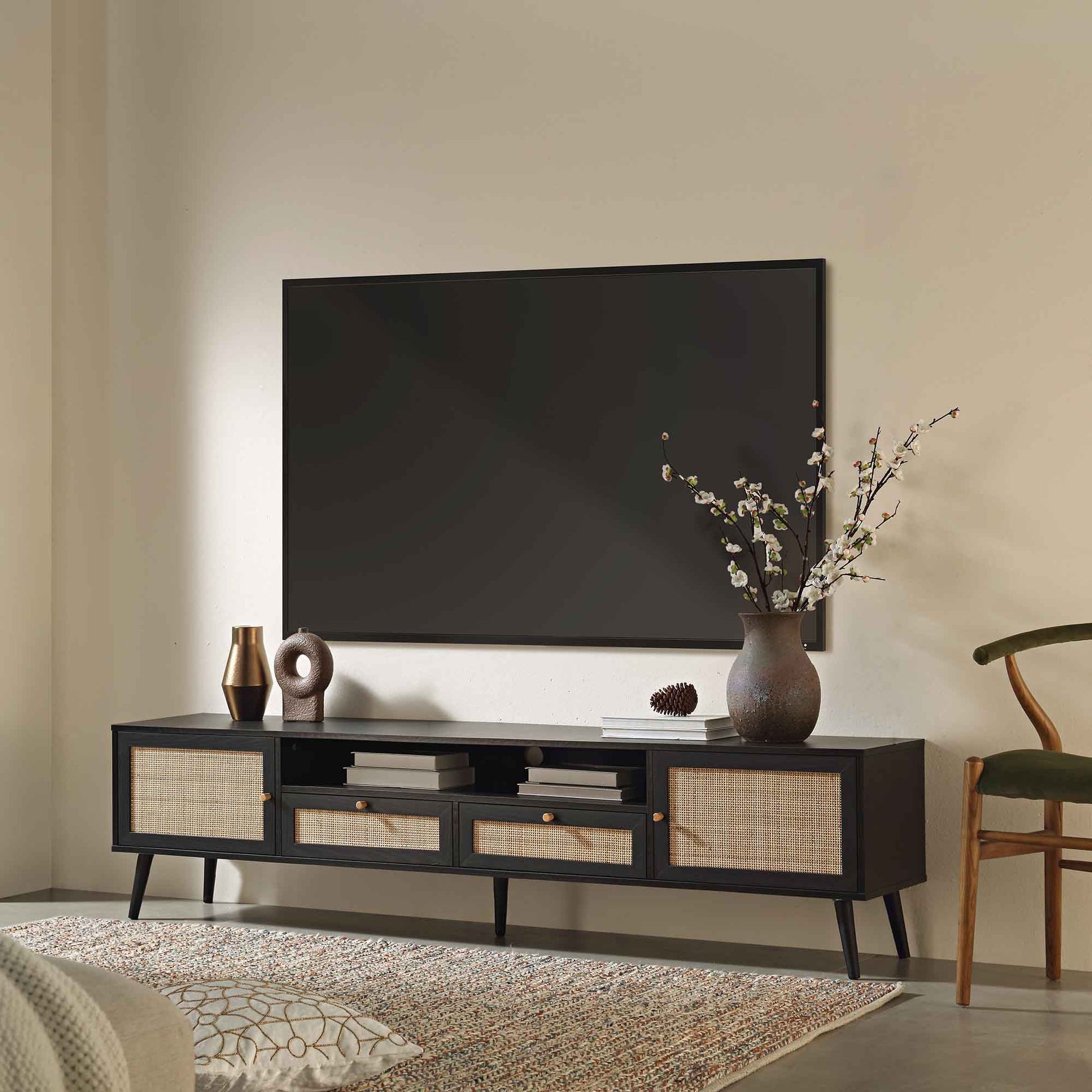 Meuble TV en rotin tressé Frances, 200 cm de large, noir