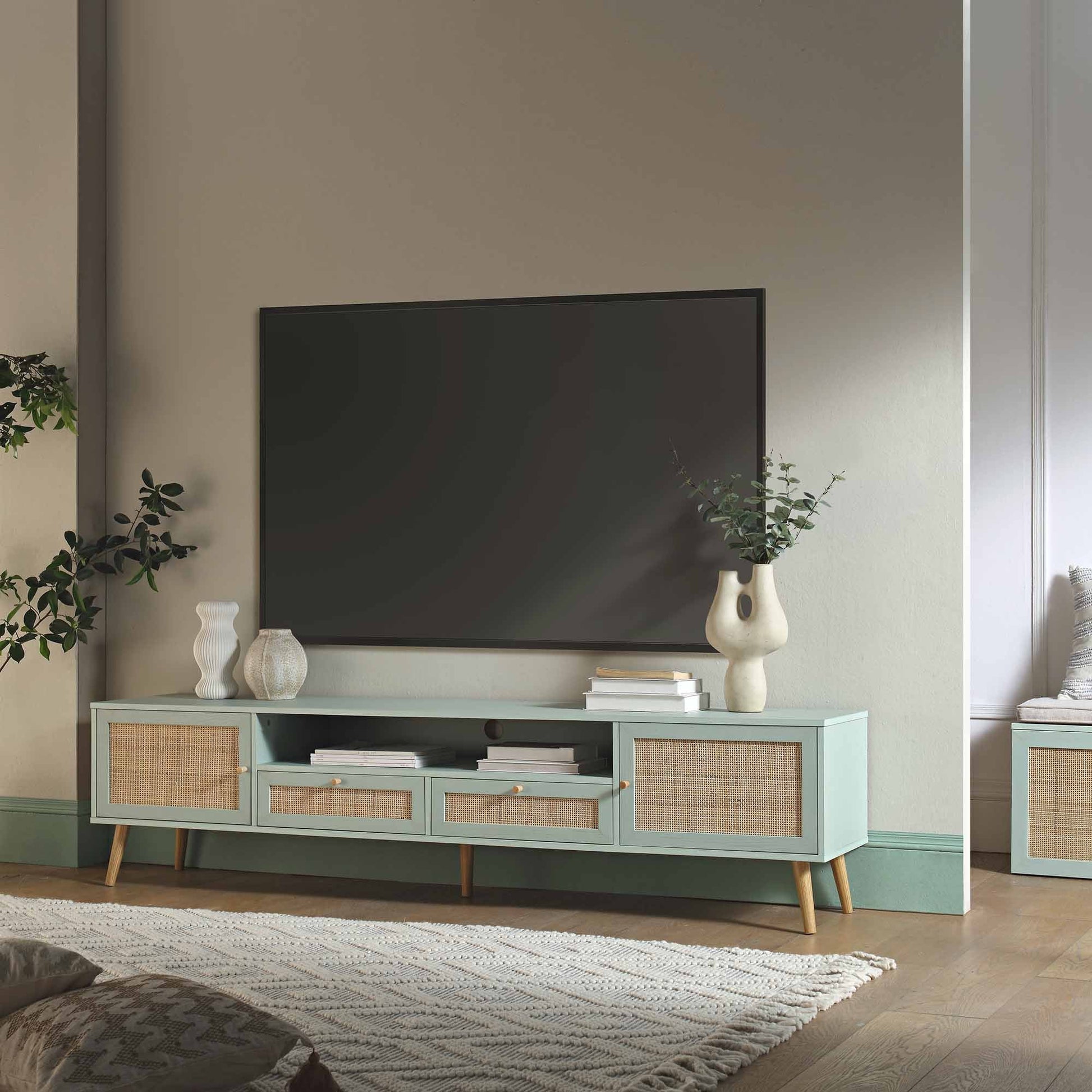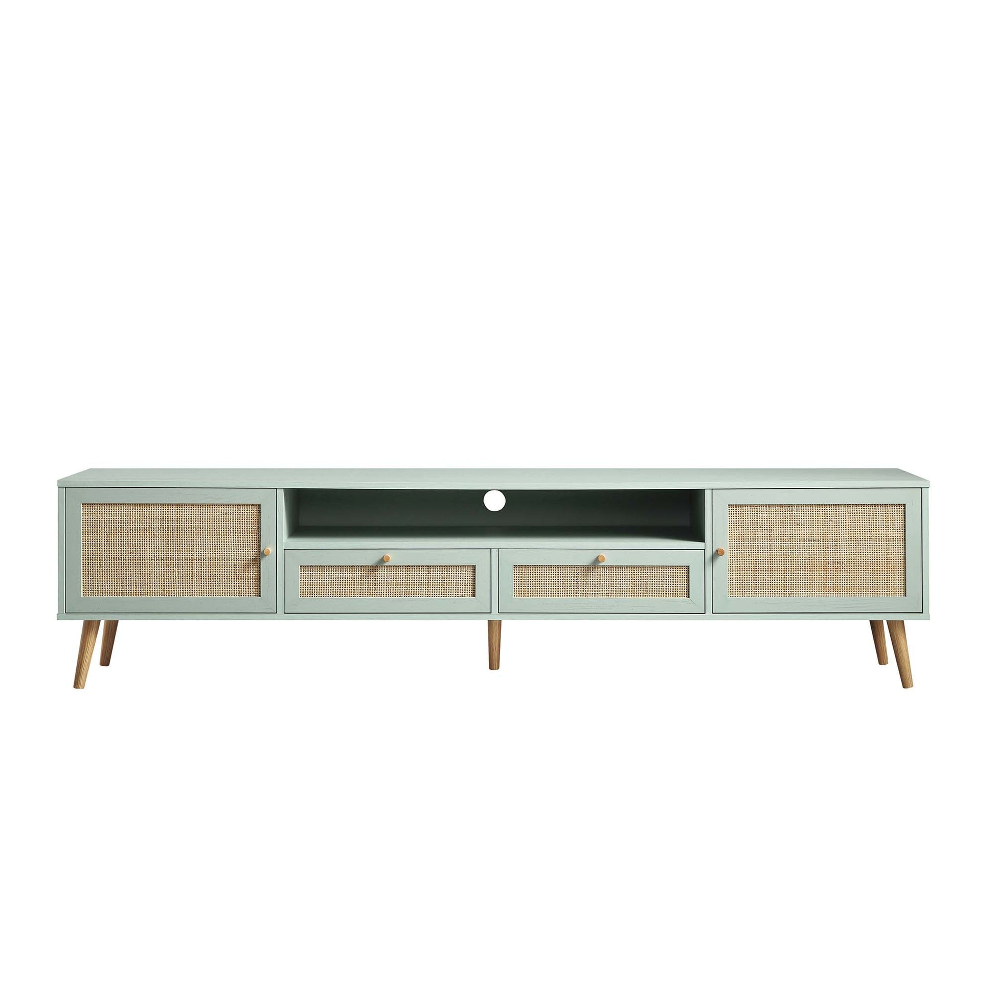 Meuble TV en rotin tressé Frances, 200 cm de large, menthe