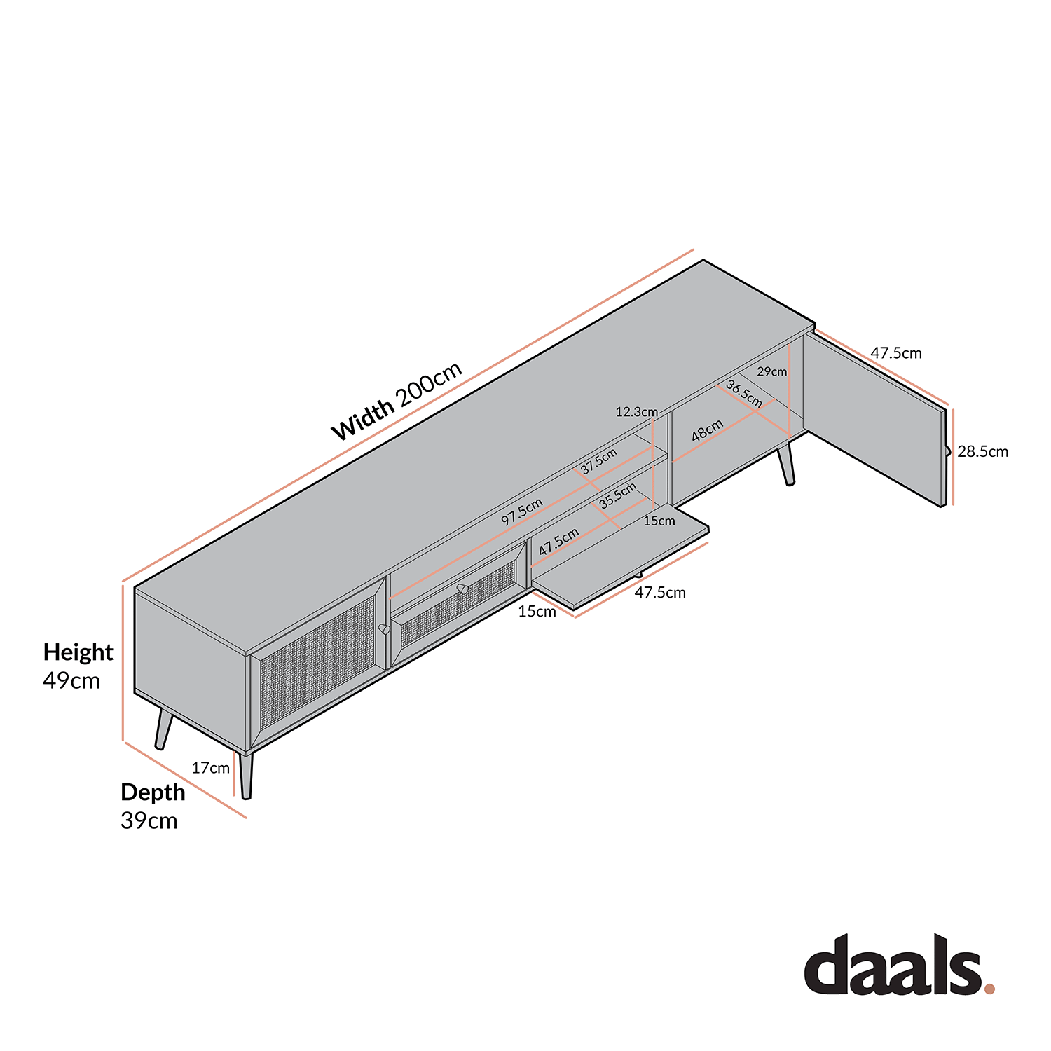 - D'une largeur de 200 cm, le meuble TV peut accueillir un téléviseur jusqu'à 80 pouces (le téléviseur présenté sur l'image du produit mesure 75 pouces).