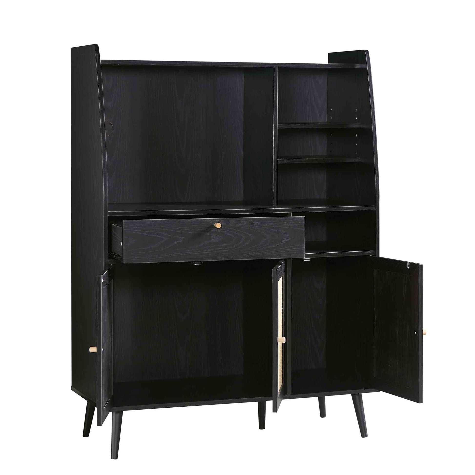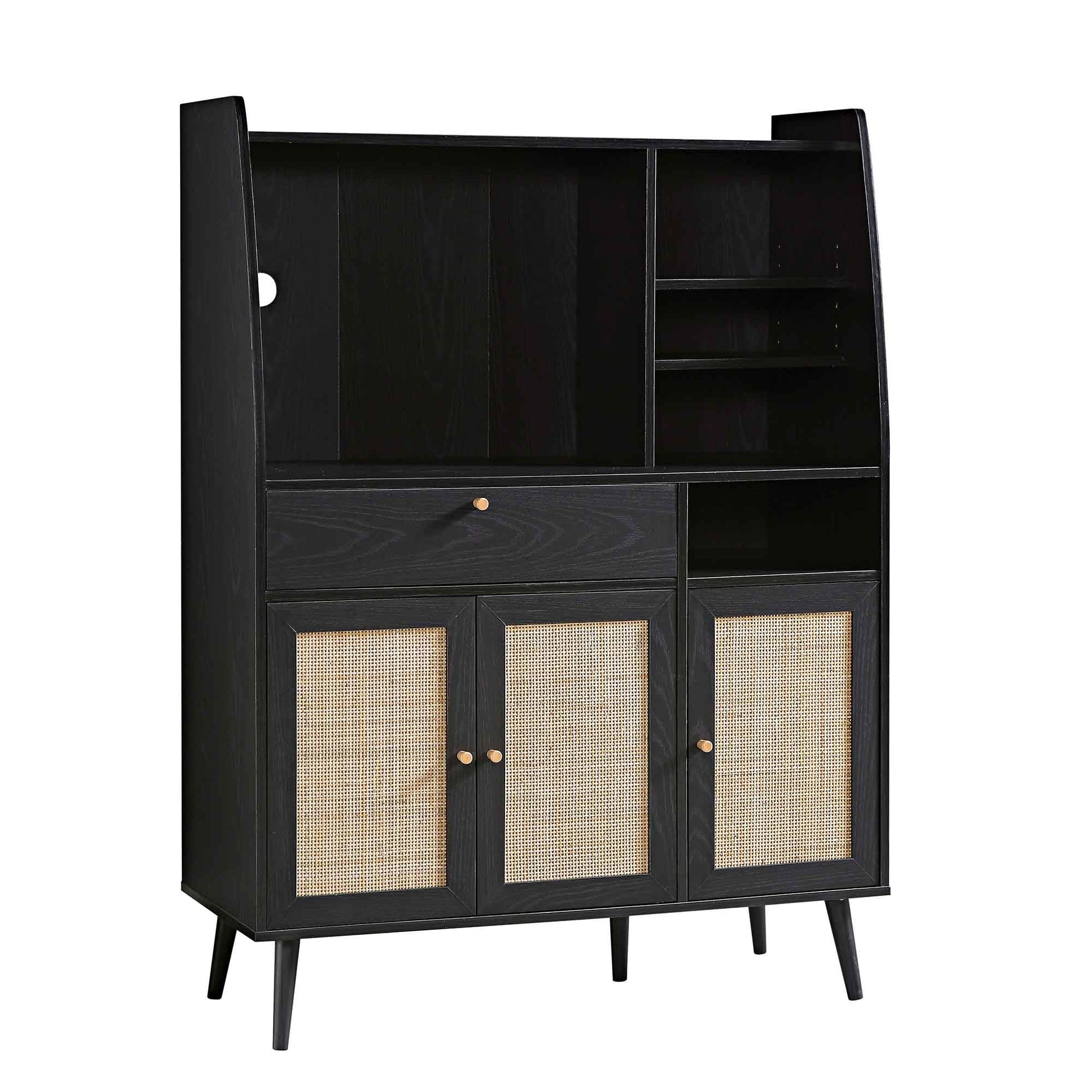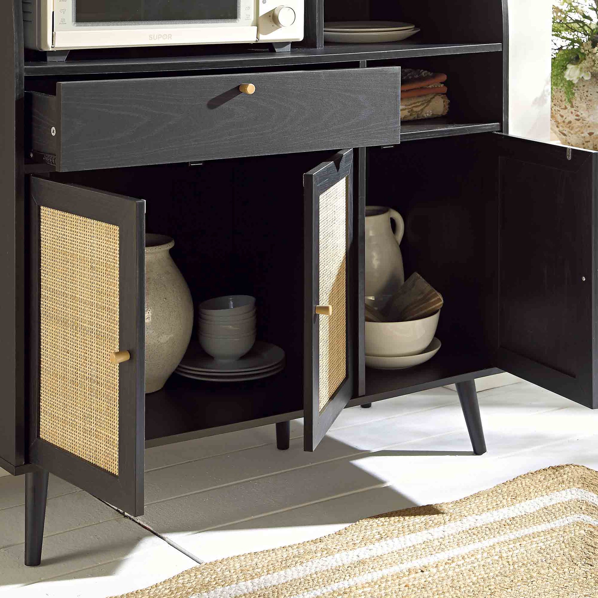 - Doté d'étagères à plusieurs niveaux, idéales pour exposer verres et petits électroménagers, ce meuble de cuisine Frances, très fonctionnel, est également doté d'un tiroir et d'un espace de rangement fermé. Les façades de portes en rotin naturel tressé à la main s'harmonisent parfaitement avec les poignées en bois massif.