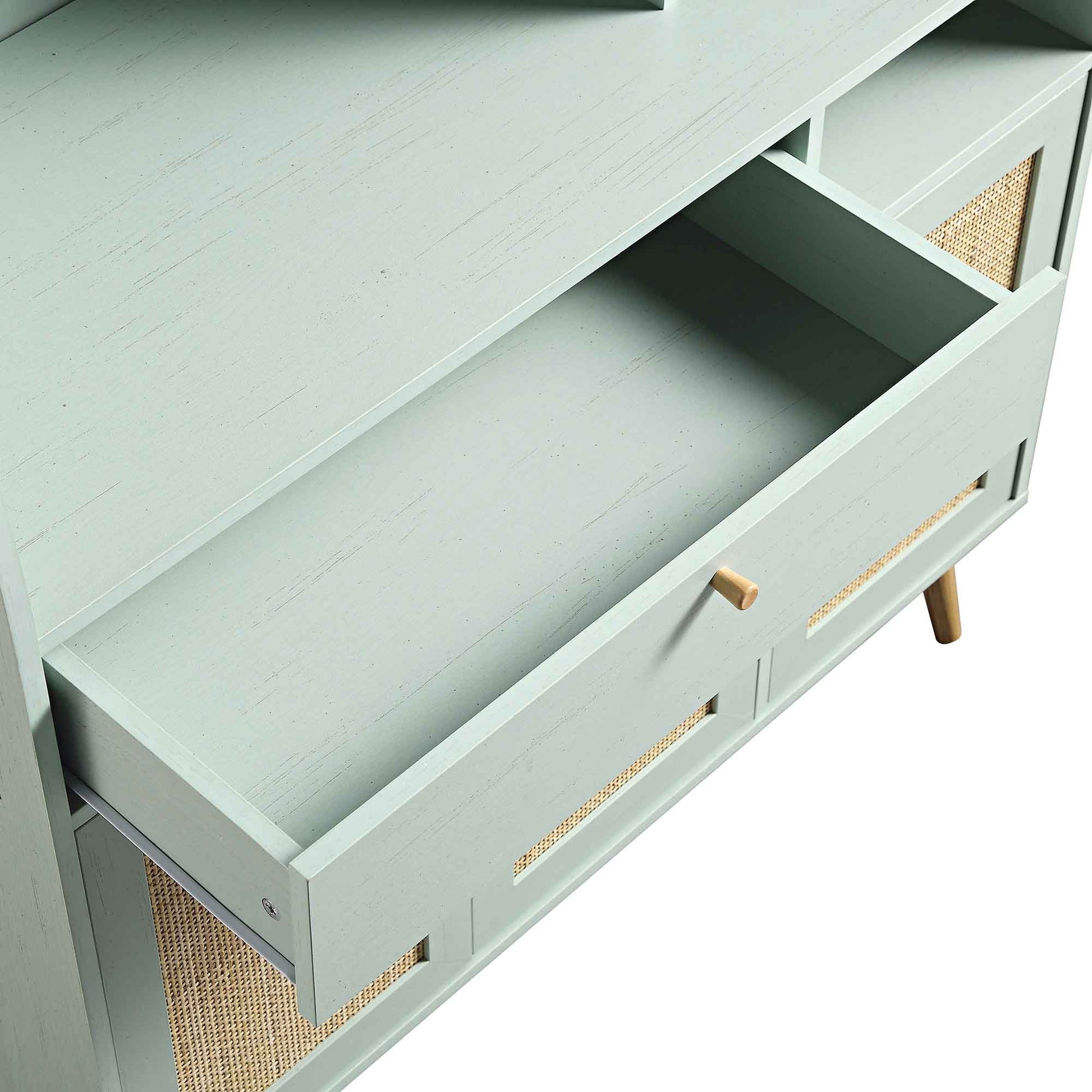 - Doté d'étagères à plusieurs niveaux, idéales pour exposer verres et petits électroménagers, ce meuble de cuisine Frances, très fonctionnel, est également doté d'un tiroir et d'un espace de rangement fermé. Les façades de portes en rotin naturel tressé à la main s'harmonisent parfaitement avec les poignées en bois massif.